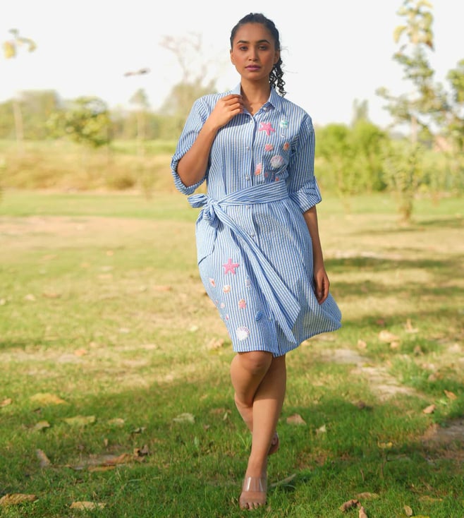 Blue & White Stripes Cotton Relaxed Fit Hand Embroidery Dress