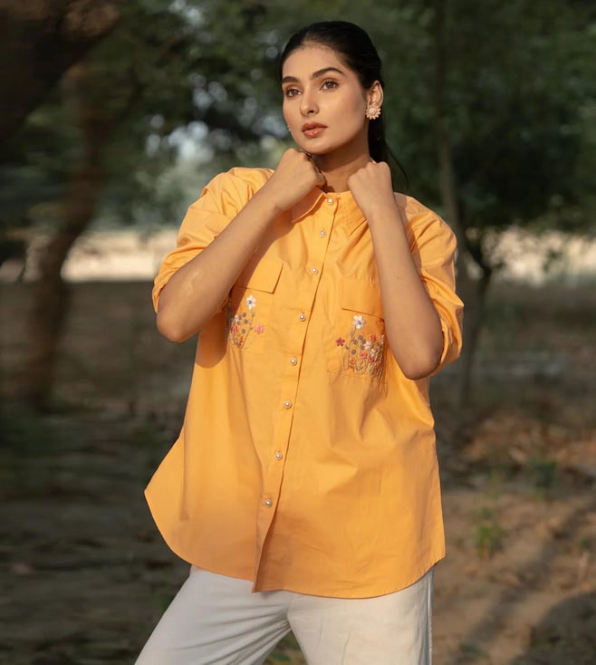 Orange Cotton Relaxed Fit Hand Embroidery Shirt