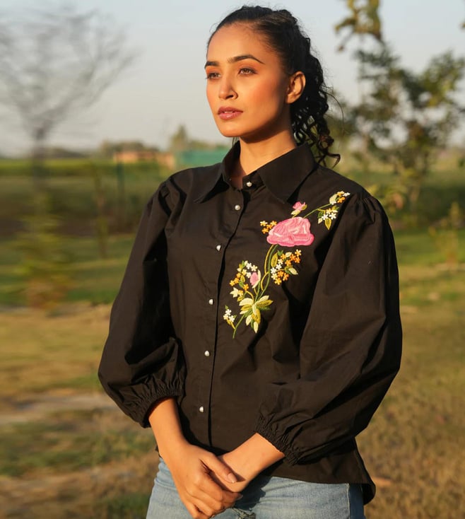 Black Cotton Relaxed Fit Hand Embroidery Shirt