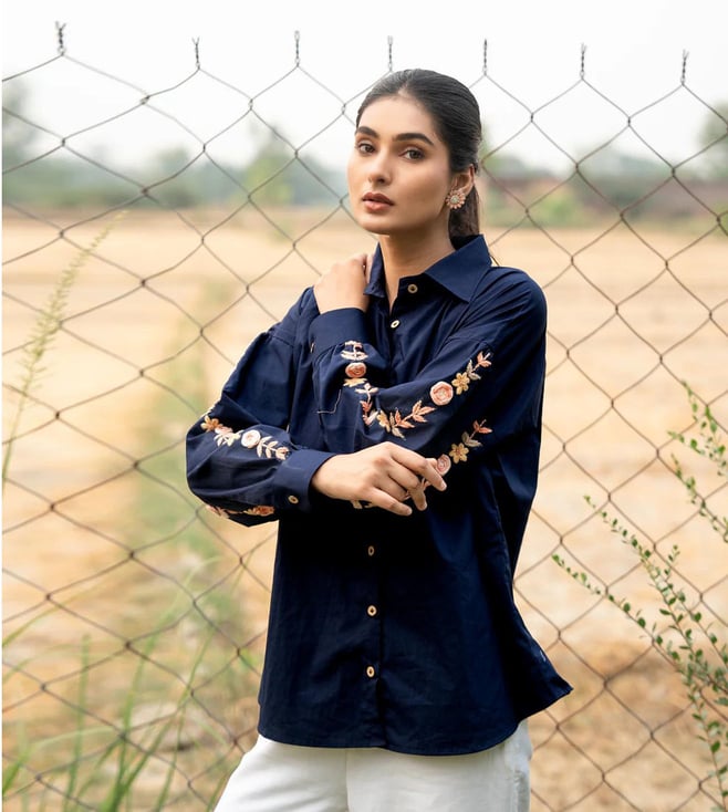 Navy Blue Cotton Relaxed Fit Hand Embroidery Shirt