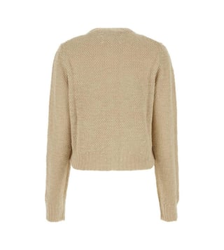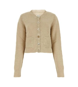 The Maison Margiela Beige Knitted Long-Sleeve Cardigan is a masterpiece of understated elegance, crafted from 100% true hemp fabric. Its soft beige hue exudes timeless sophistication, while the intricate knit pattern adds a touch of artisanal charm. Designed for the modern woman, this cardigan features a seamless closure that enhances its sleek silhouette. Perfect for layering, it effortlessly transitions from casual to chic, embodying the essence of refined luxury and sustainable fashion.