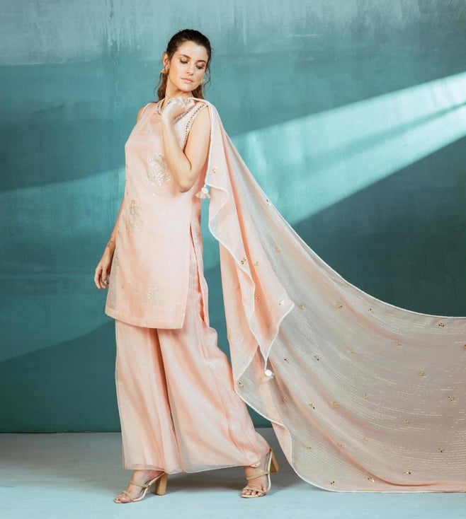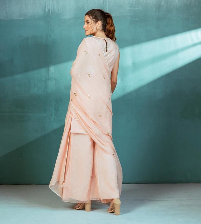 Mandira Wirk Meraki Dusky Salmon Organza Foil Printed Kurta with Pallazo and Dupatta