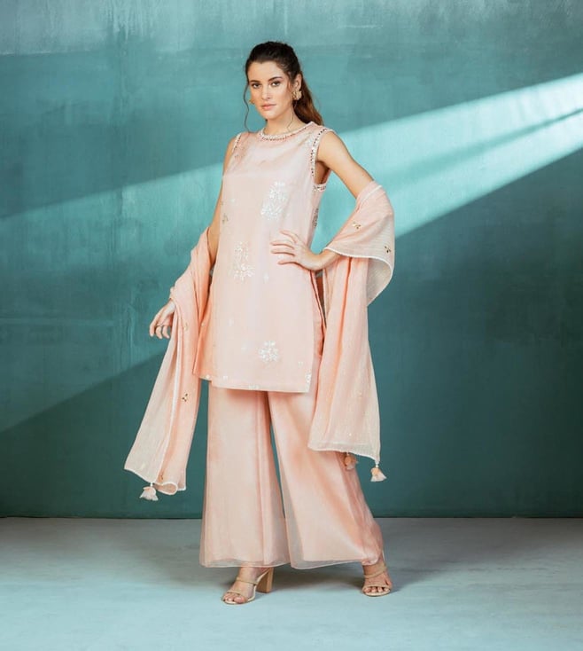 Add an extra charm to your look by wearing this kurta and palazzo set. The foil-printed embroidered short kurta has been teamed up with a pair of the wide-leg palazzo. A pearl and pathra embroidered dupatta complete the set. Crafted to perfection from organza and lurex georgette, this garment is soft on the skin and easy to maintain. Disclaimer: Product colour may slightly vary due to photographic lighting sources. Country Of Origin - India.