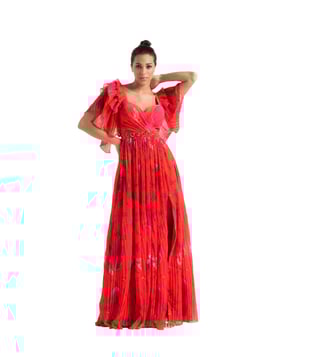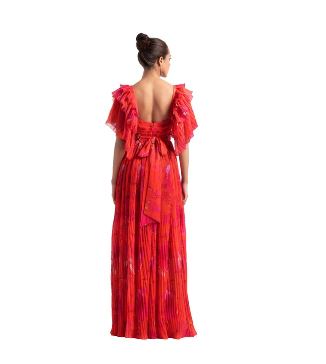 Mandira Wirk Poppy Red Heat Pleated Long Dress With Embroidered Belt