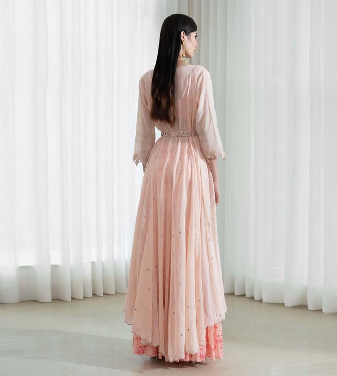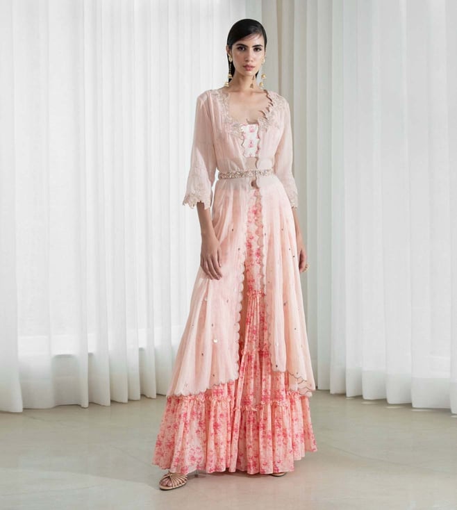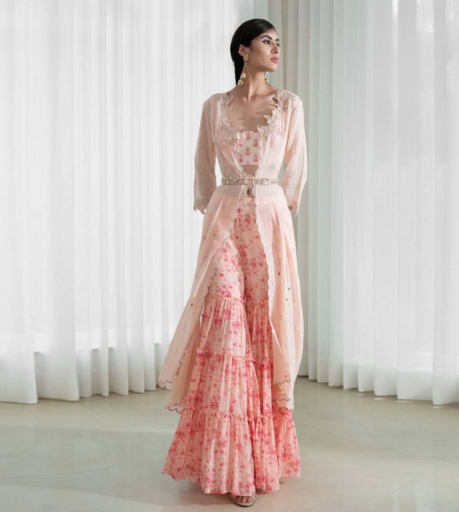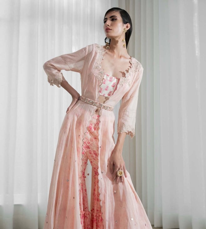 Look stylish with this peach jacket set from Mandira Wirk. The stylish neckline elevates its design. It features three-fourth sleeves. The jacket comes with cutwork gota and zari work along with mirror work and cutwork hemline. The printed patchwork blouse has a mirror and gota work. The pair of tiered sharara has a printed design. It is made from mulmul fabric. Disclaimer: All other items in the image are only for display purposes and will not be a part of the delivery content. Product colour may slightly vary due to photographic lighting sources. Country Of Origin - India.