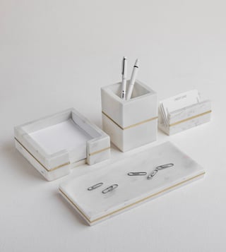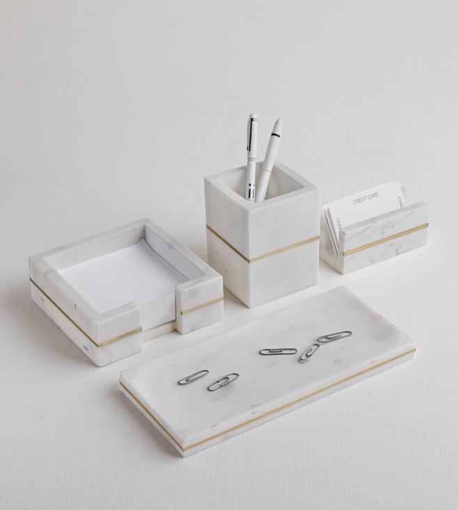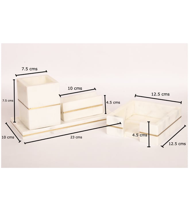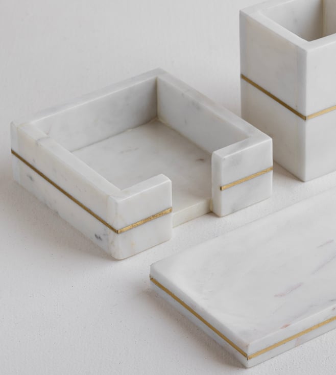Embark on an aesthetic journey with this beautiful 4-piece stationary set, a bespoke product meticulously handcrafted by local artisans with intricate brass inlay. Designed to grace your office and elevate understated spaces, these pieces are crafted from natural marble extracted from Indian mines. The artistic inlay of brass stripes, a testament to the skill of the local artisans, adds a personalized and appealing touch to this unique office ensemble.