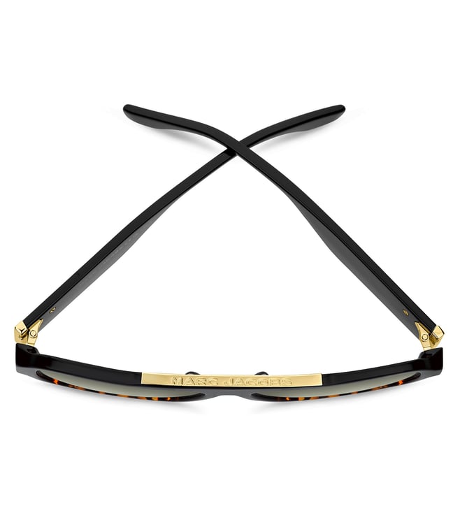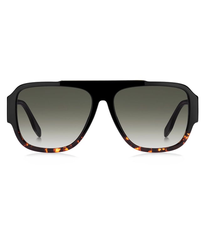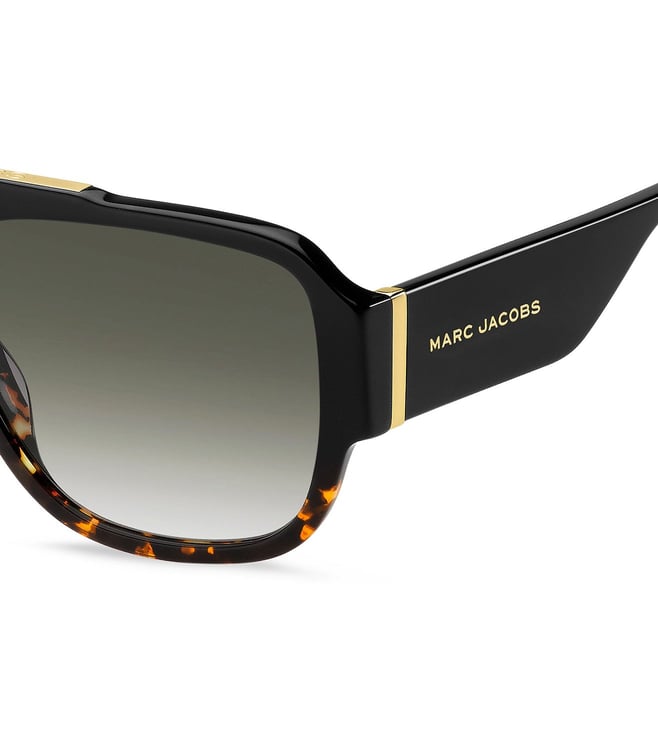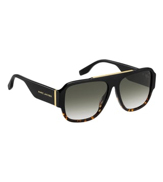 The unmistakable aesthetic of Marc Jacobs' men's eyewear is captured in the distinctive metal details that define these bold and masculine acetate sunglasses. The strong pilot shape features a flat-top braw bar, enhanced by the logo-engraved metal plaque, and sleek metal trims that accentuate the end piece. The new ultra-wide temples guarantee a high-impact look from all angles. Available in a muted palette of black and grey, complete with solid and shaded lenses.