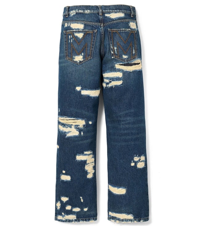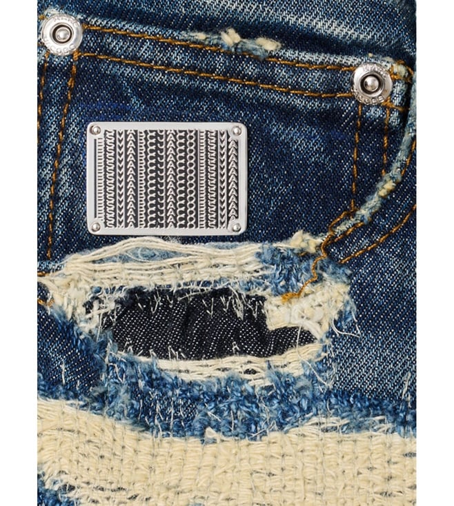 Elevate your wardrobe with the Marc Jacobs Blue Straight Fit Jeans. Designed with the rip and repair straight jean cotton denim jeans with all-over rip and repair effect, zip and button closure, five pockets with front metal logo, wide and straight leg. true to size fit, these trousers combine comfort and sophistication for everyday wear. Products purchased from Darveys are supported exclusively by the warranty/exchange policies of Darveys and its partner boutiques. Brand owners and their channel partners are not responsible for exchange/warranty services for items purchased through Darveys.