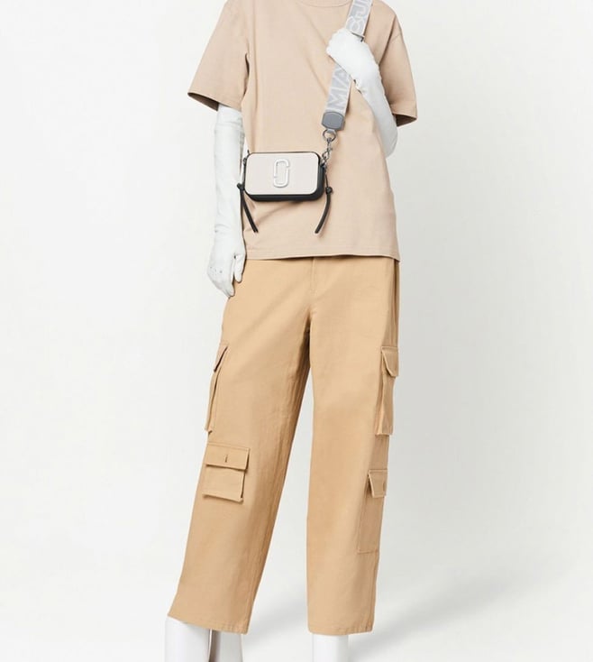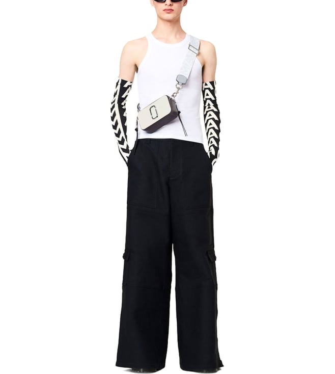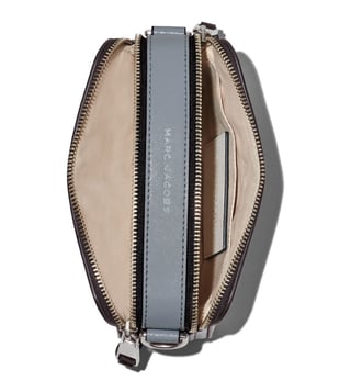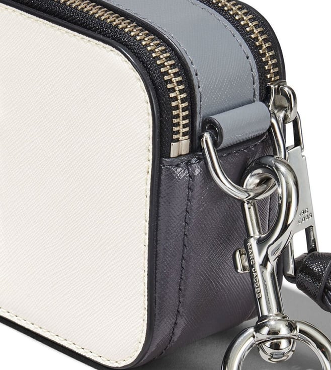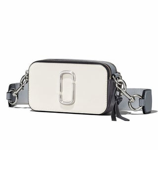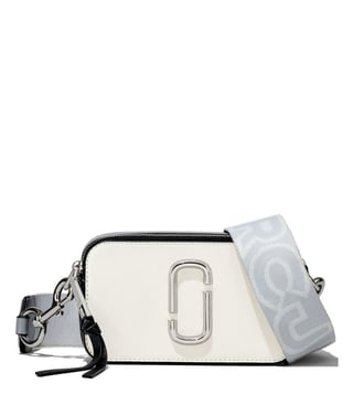 The snapshot leather crossbody bag from marc jacobs featuring white, black, grey, leather, logo plaque, internal logo patch, logo-print strap, silver-tone hardware, top zip fastening, adjustable detachable shoulder strap, partitioned compartment, internal polyurethane 100 percent.
