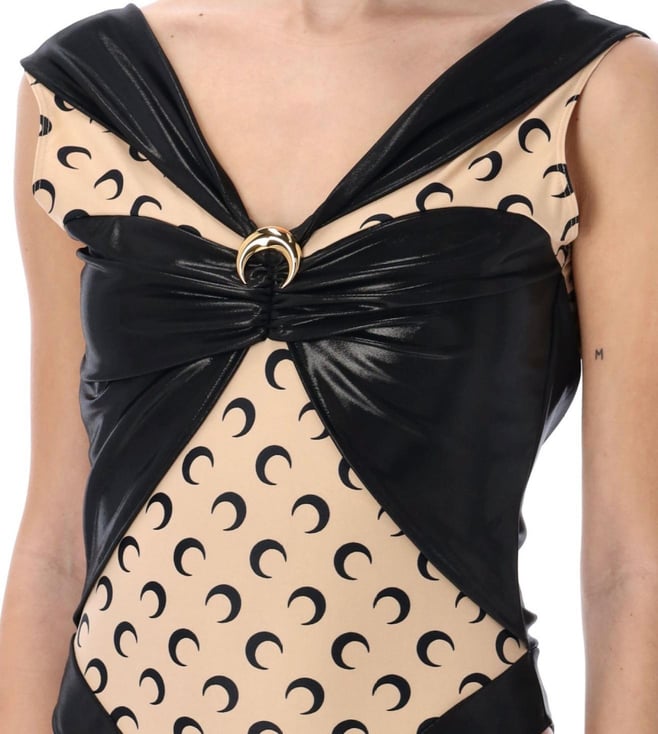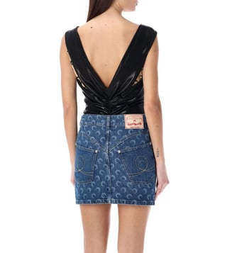 The Marine Serre Black Draped Viscose Bodysuit is a striking fusion of elegance and modernity, crafted for the discerning woman. Its regular fit gracefully contours the body, showcasing a sleek silhouette. The luxurious blend of 78% polyamide and 22% elastane ensures a comfortable, flexible wear. The bodysuit features a sophisticated draped design, exuding an air of avant-garde chic. Perfect for any occasion, its seamless closure adds a touch of refinement to this timeless piece.