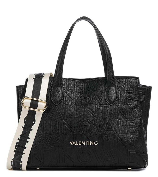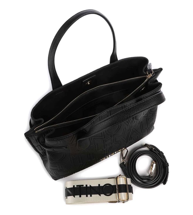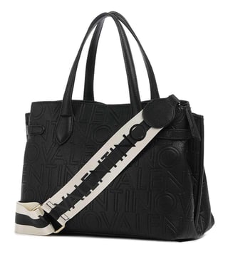 Mario Valentino Black Pansy Medium Tote crafted in polyurethane featuring zip closure, 2 compartments, middle zip compartment, inside zip pocket, metal logo, dual carry handles with removable and adjustable crossbody strap. Products purchased from Darveys are supported exclusively by the warranty/exchange policies of Darveys and its partner boutiques. Brand owners and their channel partners are not responsible for exchange/warranty services for items purchased through Darveys.