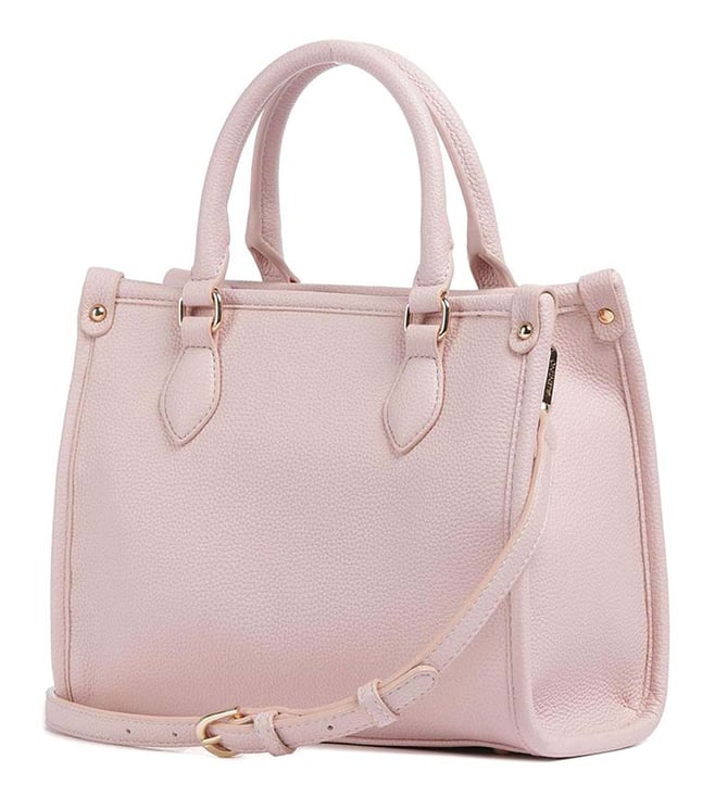 Mario Valentino Light Pink Rised Re Small Satchel crafted in polyurethane featuring zip closure, 1 compartment, inside zip and slip pockets, front logo, dual carry handles with removable and adjustable crossbody strap. Products purchased from Darveys are supported exclusively by the warranty/exchange policies of Darveys and its partner boutiques. Brand owners and their channel partners are not responsible for exchange/warranty services for items purchased through Darveys.