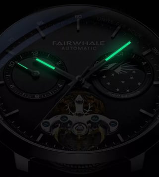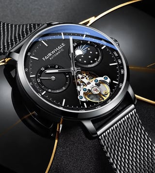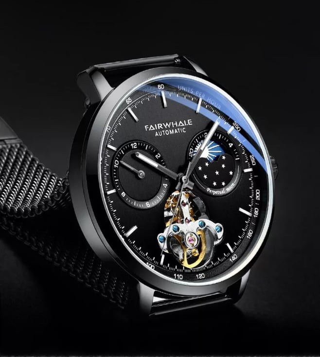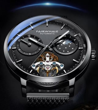 A symphony of time, this exquisite timepiece boasts a mechanical heart that beats with precision and grace. Its sleek black dial, adorned with celestial details, hints at a universe of possibilities, while the intricate open-heart design offers a glimpse into the magic within. A statement piece for the discerning gentleman, this watch is not just an accessory, but a work of art. In the lap of luxury with this fairwhale automatic watch. Its sophisticated design, with a moon phase indicator and a perpetual calendar, speaks of refinement and exclusivity. The meticulously crafted.