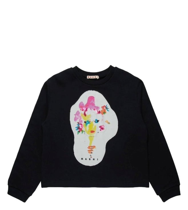 Elevate your casual wardrobe with the Marni Black Sequin Face Art Portrait Printed Comfort Fit Sweatshirt. This unique piece from Marni Kids features intricate applique detailing for a modern touch, while the classic crew neck and ribbed cuffs and hem ensure a cozy and comfortable fit. Made from 100 percent cotton, this sweatshirt effortlessly combines style with everyday comfort. Add a fashionable twist to your look with this must-have sweatshirt.