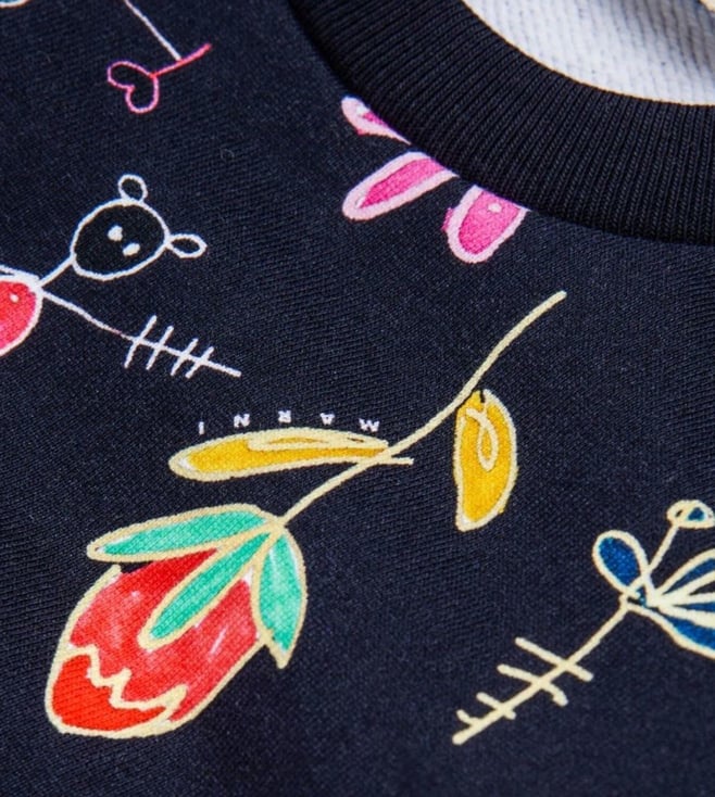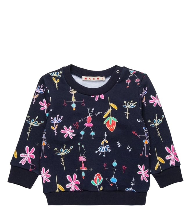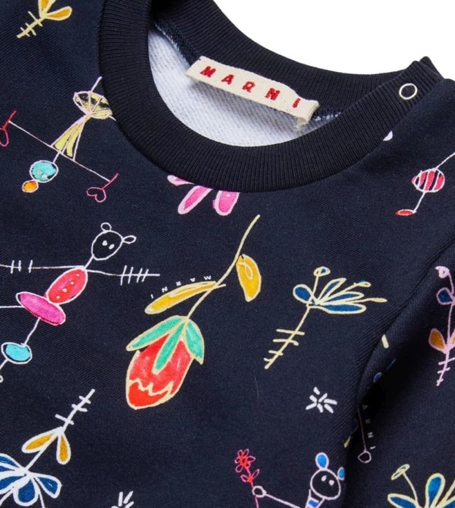 Elevate your little ones style with the Marni Blue Floral Printed Comfort Fit Sweatshirt. Crafted from 100 percent soft cotton, this sweatshirt offers both comfort and breathability for all-day wear. The charming floral print adds a playful and stylish touch, making it perfect for any casual occasion. Whether it is a playdate or everyday wear, this sweatshirt is sure to become a favorite in your childs wardrobe.