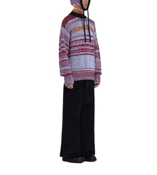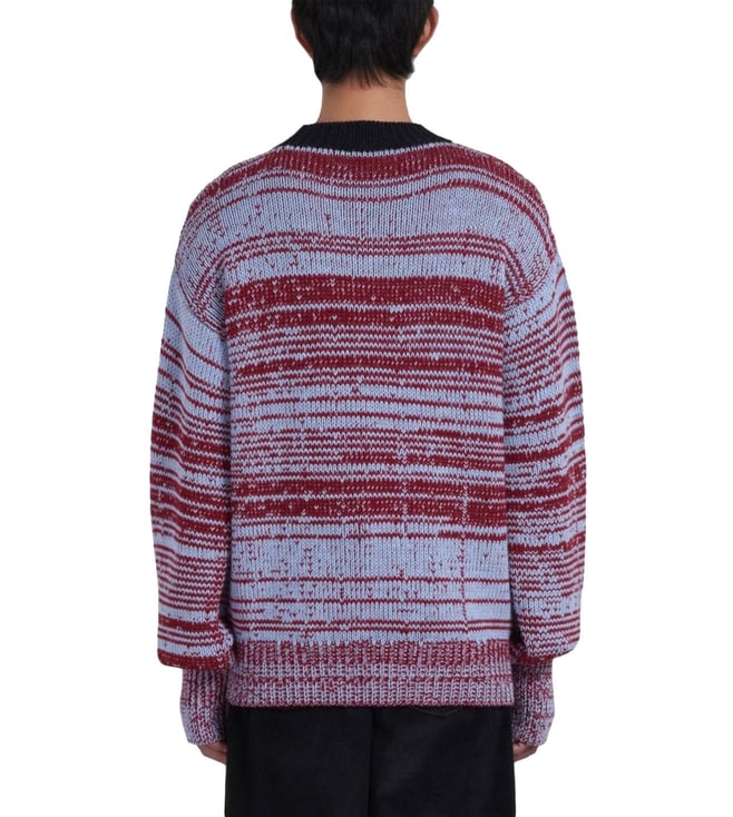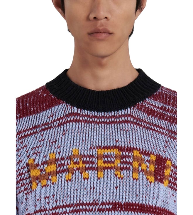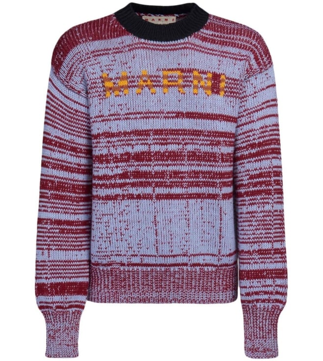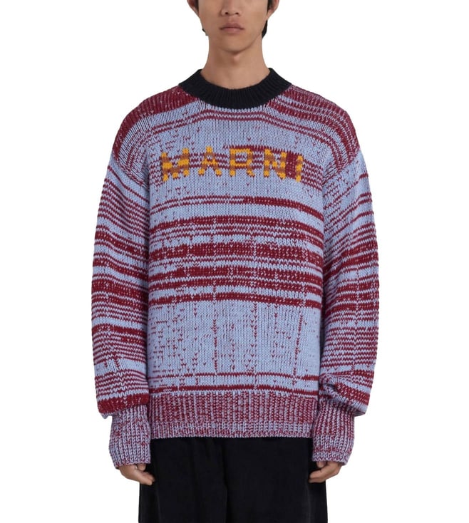 Elevate your style with the Marni Red Striped Oversized Fit Sweater. Dark red, light blue intarsiaknitlogo, wool sweater from marni featuring wool, knitted construction, intarsia knit logo, drop shoulder, crew neck, long sleeves and ribbed cuffs and hem. Size it. Products purchased from Darveys are supported exclusively by the warranty/exchange policies of Darveys and its partner boutiques. Brand owners and their channel partners are not responsible for exchange/warranty services for items purchased through Darveys.