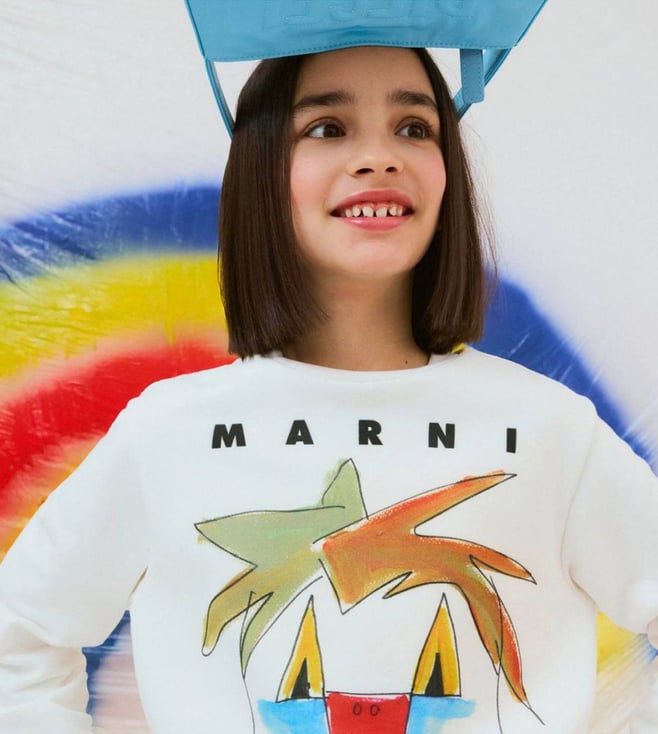 Elevate your childs style with the Marni Ivory Graphic Print Comfort Fit Sweatshirt. Made from pure cotton, this sweatshirt is both soft and breathable, perfect for all-day wear. The bold logo print and playful graphic on the front add a modern twist to the classic white design. With a comfortable round neck and long sleeves, this sweatshirt offers both style and comfort. Upgrade your little ones wardrobe with this trendy piece that is sure to turn heads.