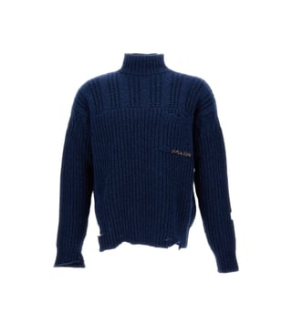 Elevate your style with the Marni Navy Blue Jumper. Wool jumper with high-necked cable knit pattern. Logo embroidery detail. Wear work on hems. Over fit. Made in Italy. Colour: blue. Products purchased from Darveys are supported exclusively by the warranty/exchange policies of Darveys and its partner boutiques. Brand owners and their channel partners are not responsible for exchange/warranty services for items purchased through Darveys.