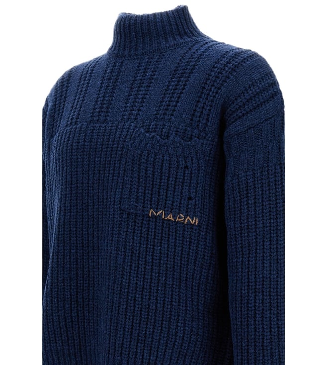 Elevate your style with the Marni Navy Blue Jumper. Wool jumper with high-necked cable knit pattern. Logo embroidery detail. Wear work on hems. Over fit. Made in Italy. Colour: blue. Products purchased from Darveys are supported exclusively by the warranty/exchange policies of Darveys and its partner boutiques. Brand owners and their channel partners are not responsible for exchange/warranty services for items purchased through Darveys.