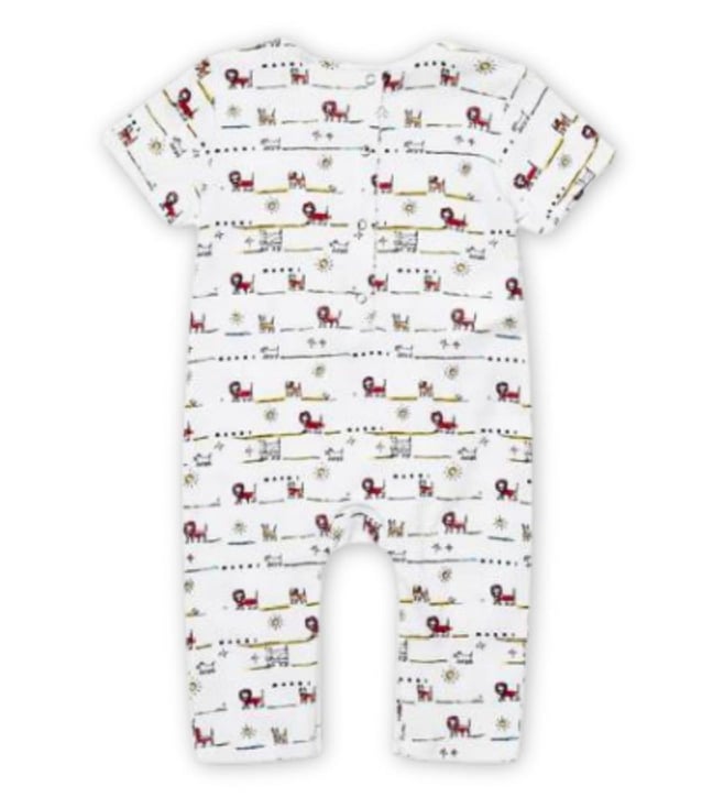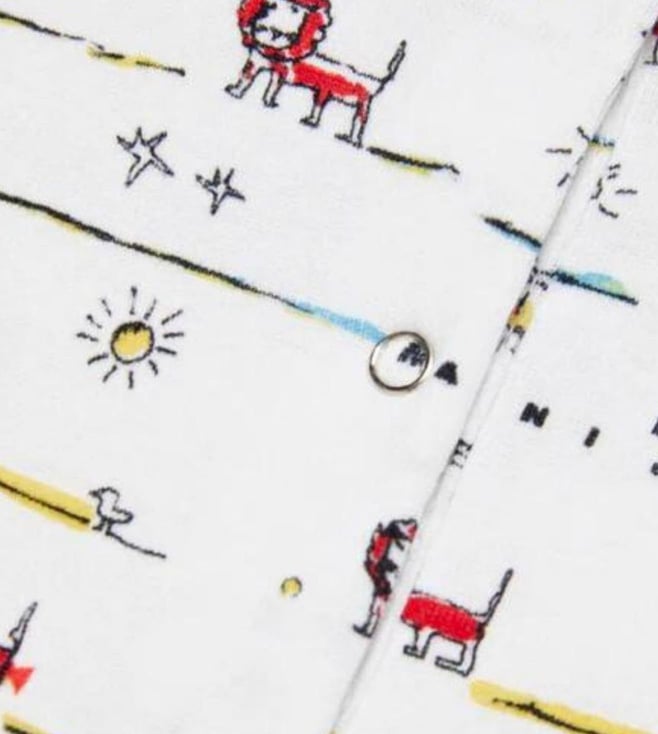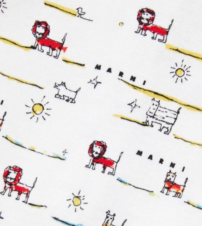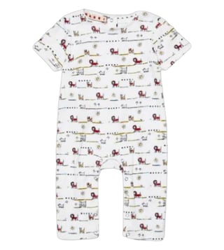 Introducing the Marni White Animals Printed Comfort Fit Romper, the perfect blend of style and comfort for your little one. This short-sleeved jersey romper features adorable animal-themed graphics, making it a fun and playful addition to their wardrobe. The convenient button closure on the shoulder and crotch ensures easy dressing and changing. Whether theyre crawling, playing, or napping, this romper will keep them cozy and looking cute all day long. Upgrade their outfit rotation with this versatile and charming piece.
