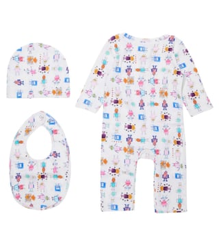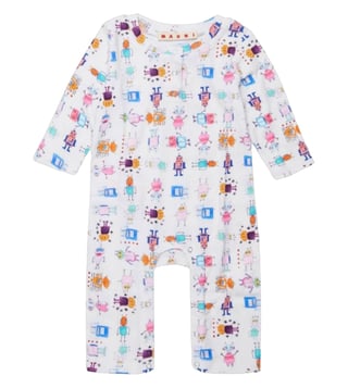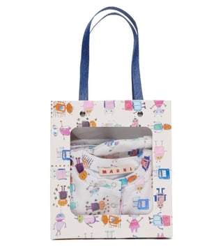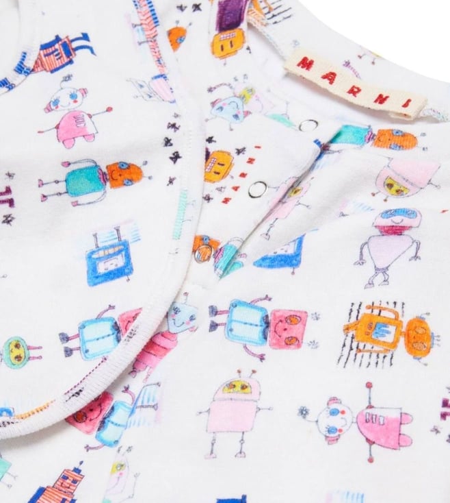 Dress your baby in style and comfort with the Marni White Graphic Print Comfort Fit Romper. This three-piece cotton babygrow set features an eye-catching graphic print and a convenient front press-stud fastening for easy changes. Perfect for gifting or everyday wear, this set comes in a charming gift box, making it a must-have for any stylish babys wardrobe. Add a touch of luxury and fashion to your little ones wardrobe with this adorable romper set from Marni Kids.