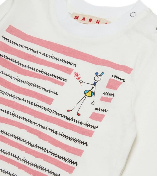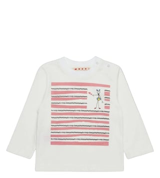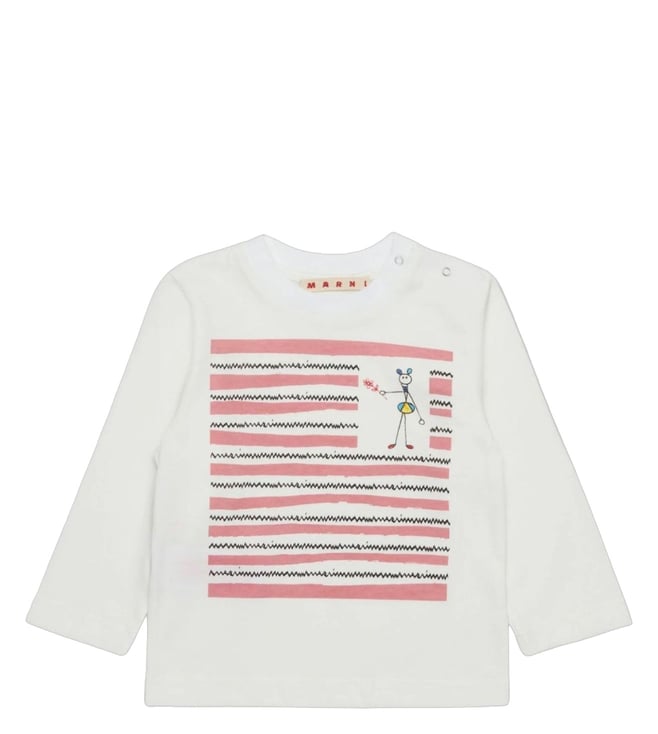 Elevate your baby girls style with the Marni White Graphic Print Comfort Fit T-Shirt. Made from 100 percent pure cotton, this tee is luxuriously soft and perfect for everyday wear. The cute graphic design adds a playful touch, making it a versatile choice for any casual outing. Keep your little one comfortable and chic with this must-have wardrobe staple.