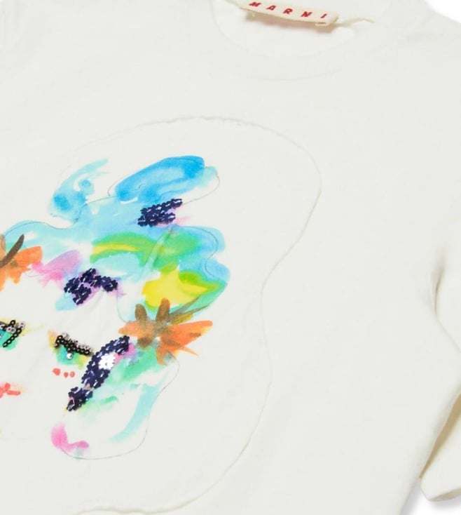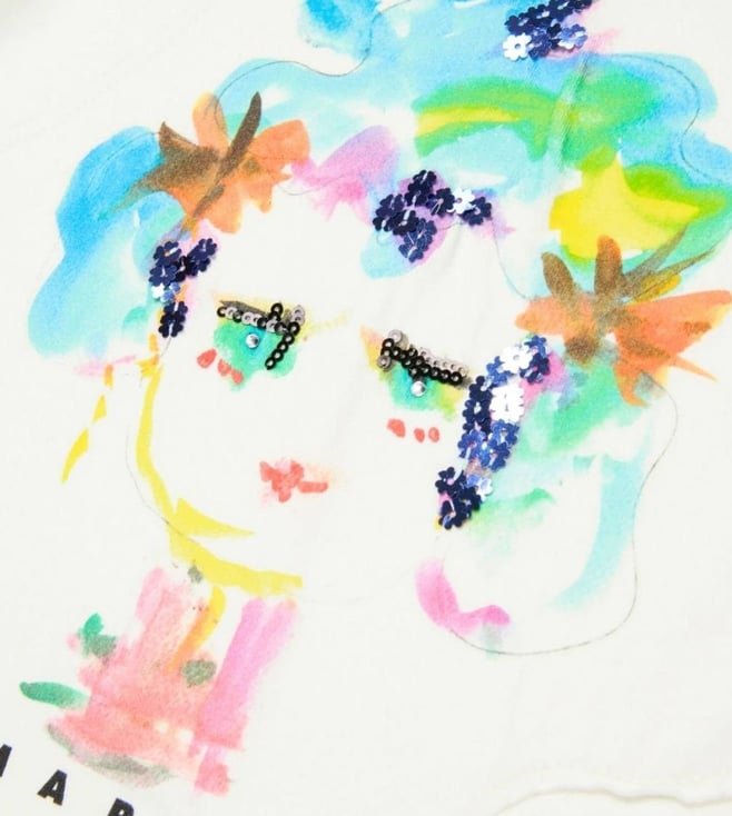 Elevate your little ones wardrobe with the Marni White Sequin Portrait Printed Comfort Fit T-Shirt. This versatile staple is infused with charm, featuring delicate applique detailing on the front for a touch of whimsy. Crafted from 100 percent soft cotton, this classic crew neck tee offers both comfort and effortless style with its short sleeves and straight hem. Perfect for everyday wear, this tee is a must-have for your childs closet.