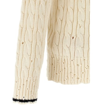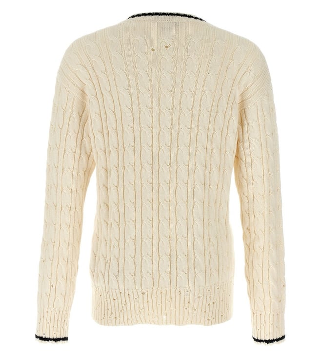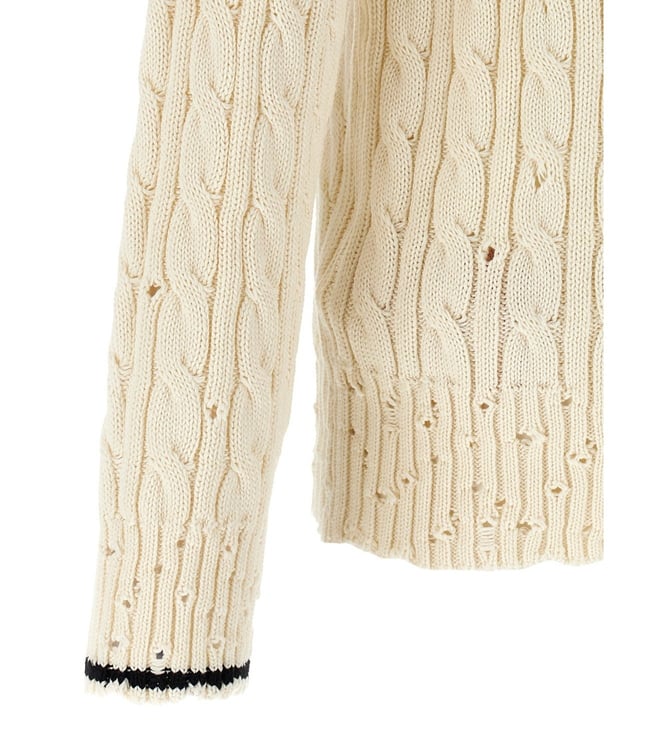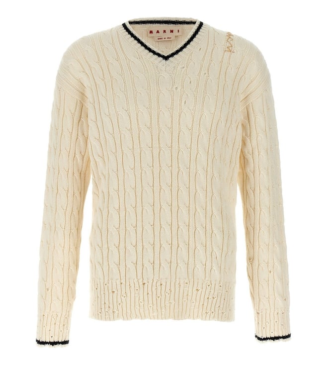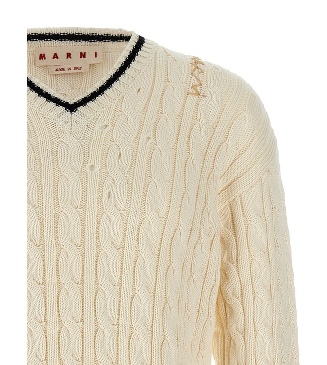 Elevate your style with the Marni Cream Braided Sweater. Cotton sweater with v neckline, slightly perforated braid, used effect edges, logo embroidery detail, long cuffed sleeves. True to size fit. Products purchased from Darveys are supported exclusively by the warranty/exchange policies of Darveys and its partner boutiques. Brand owners and their channel partners are not responsible for exchange/warranty services for items purchased through Darveys.