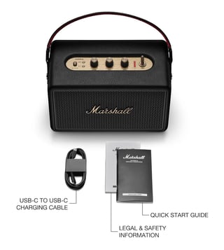 Speaker, USB-C to USB-C charging cable, Quick Start Guide, Legal and Safety Information