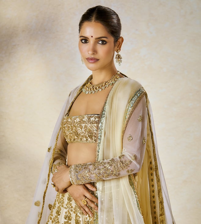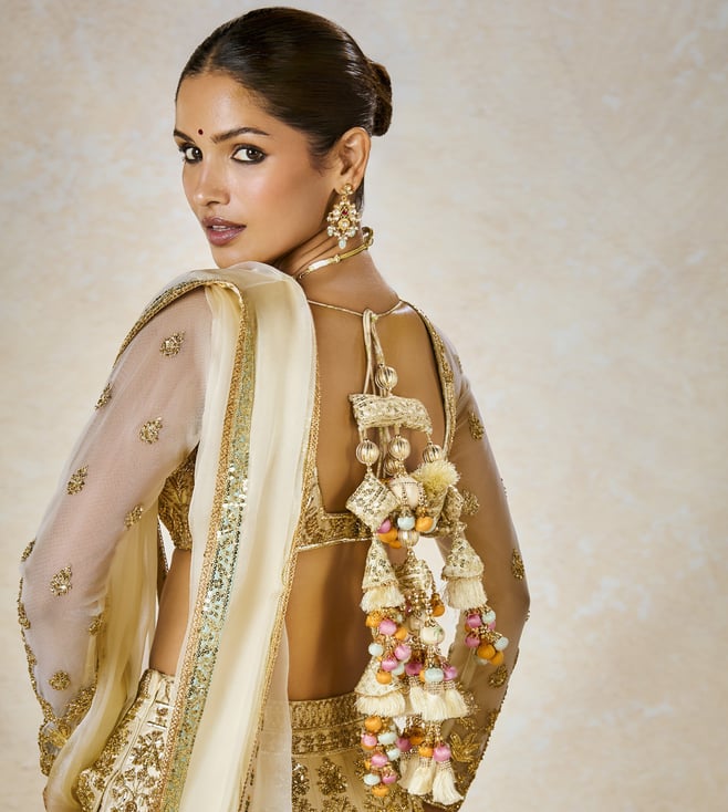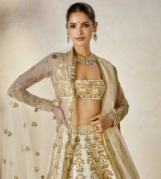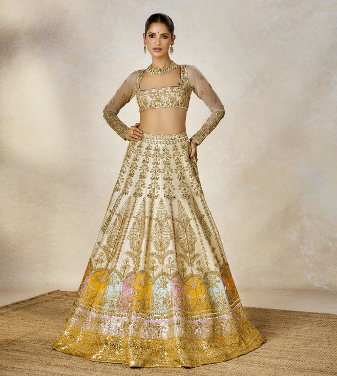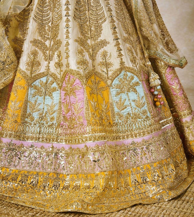 The colorful Bombay Barfi lehenga is brought to life on a creamy silk with the help of our 'Gul Jharokha' motif sitting at the base. This motif has been carefully appliqued in the varying sorbet shades in the shape of dainty windows and further intricately embroidered with bright gold. It is paired with an ornate gold blouse and a flowy sheer dupatta that drapes like a dream, making this ensemble perfect for brides.