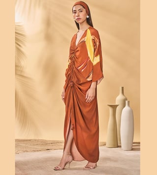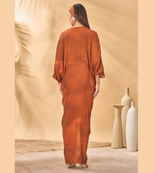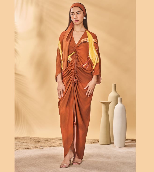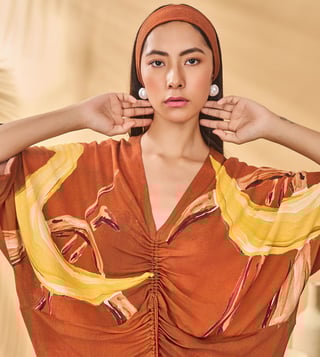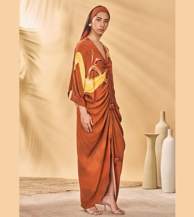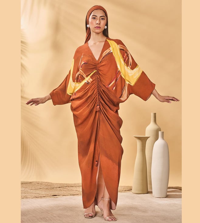 The Masaba Brown Crepe Silk Semi Fitted Kaftan This Women'S Dress Combines Traditional Fabric With Vibrant Colors For A Unique Style. Disclaimer: All Other Items In The Image Are Only For Display Purposes And Will Not Be A Part Of The Delivery Content. Product Colour May Slightly Vary Due To Photographic Lighting Sources. Country Of Origin - India.