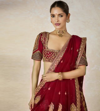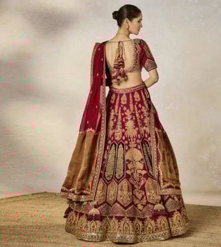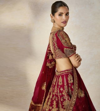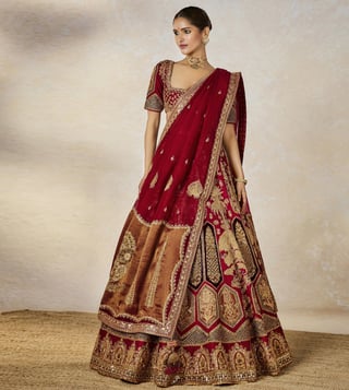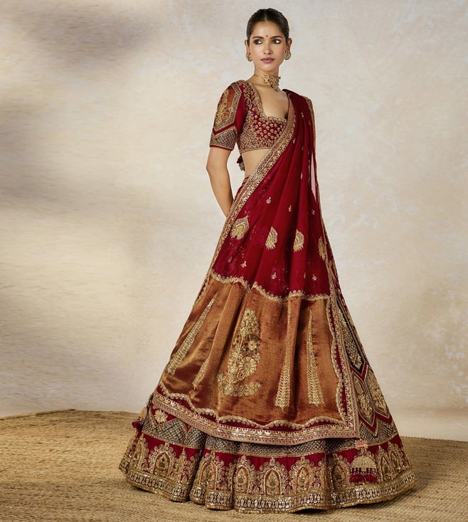 Resplendence takes a rare form in this ornate ensemble. The Anar Bagh lehenga is a velvet patchwork lehenga adorned with our Anant Bel and Anasam Rekha motifs, which has tissue inlays running across the the bottom of the lehenga. Our Baug Taj motifs are intricately embroidered on the tissue and finished with a jaal tissue patchwork. Comes with a separate cancan.