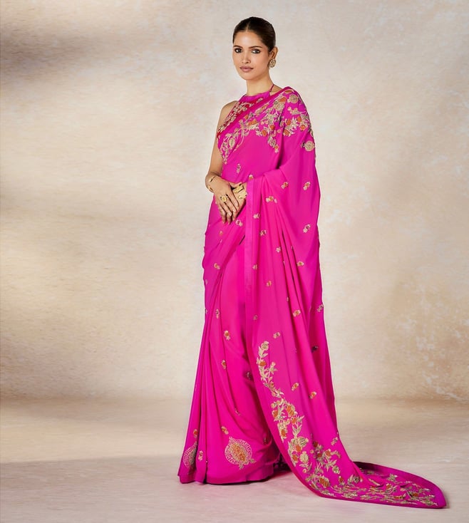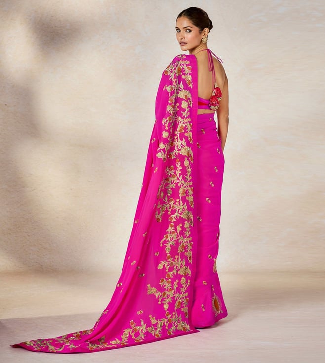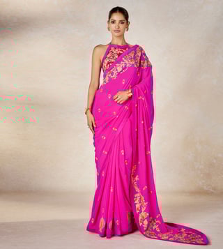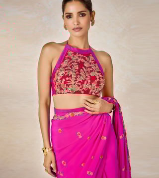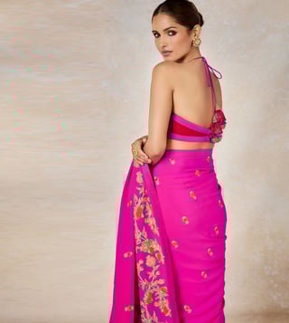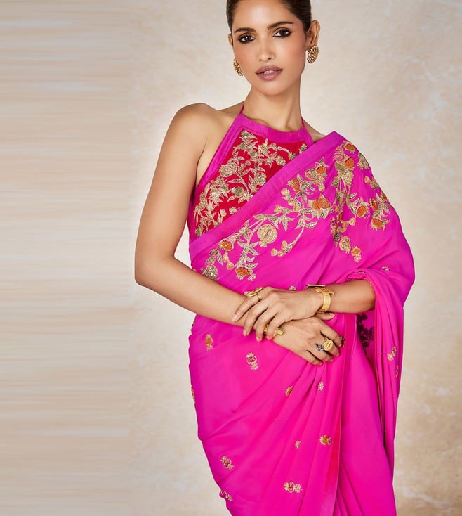 A resplendant vision in gold, The Son Barfi saree is designed in gold tissue. A broad patchwork pallu in a bright lime green and our Anasam Phool motifs in gold. Finished with a reverse scallop border in gold and a multi color border and paired with a lime green scoop neck patchwork blouse with intricate gold dori and sequins work. The dupatta is adorned with ananas motifs in striped multicolor border with dori and sequins work .