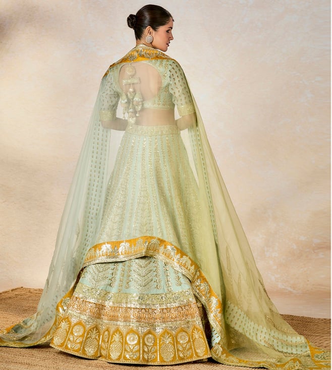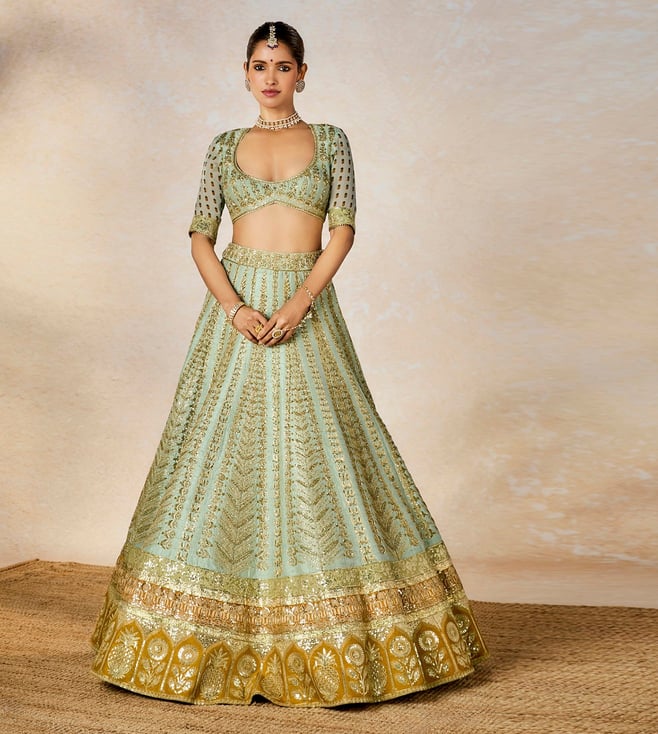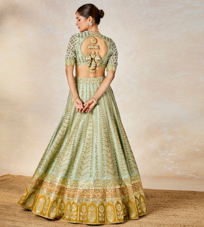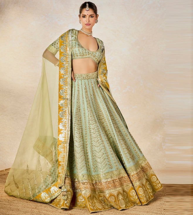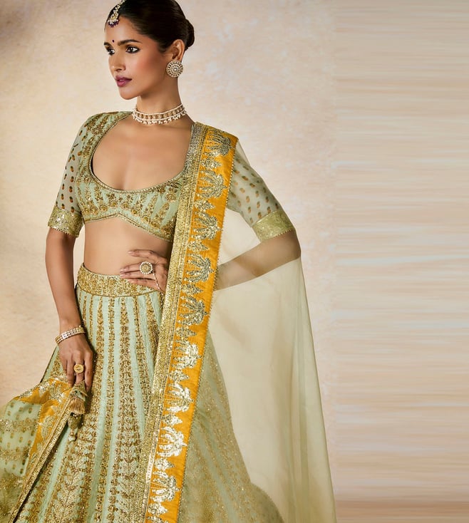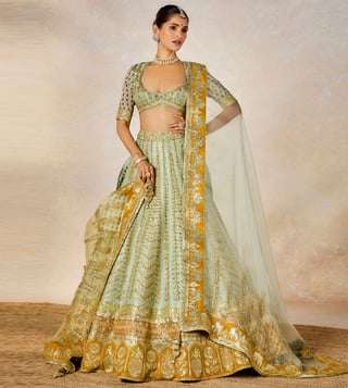 The Kashni lehenga is a sage green heavily embelished lehenga set on a silk background with motifs inspired by 'Amaltas', 'Sehra' realized through sitara and moti embroidery. Finished with a contrast ochre border that adds some whimsy, this is for the bride who prefers subtle glamour whilst remaining true to her traditional roots.