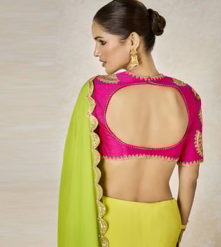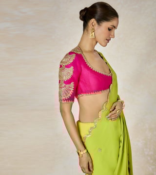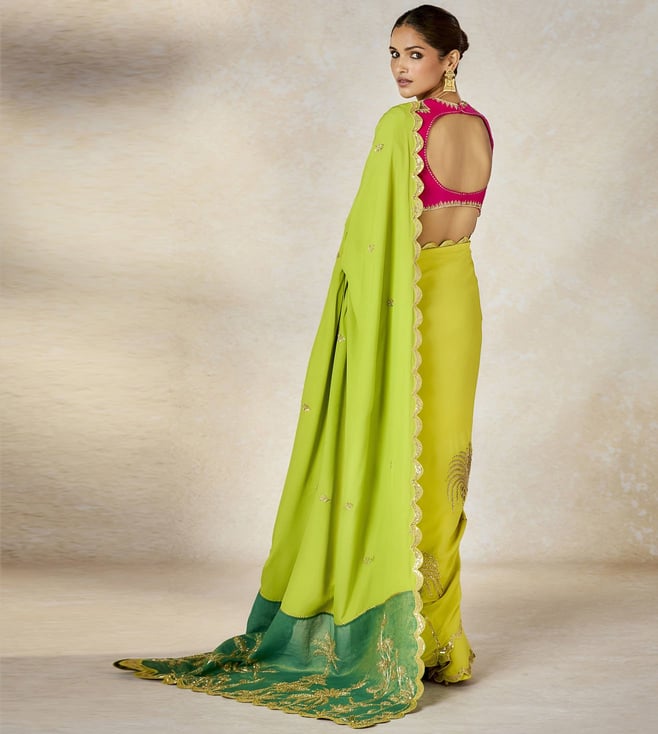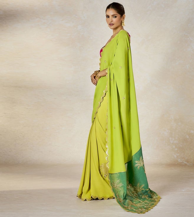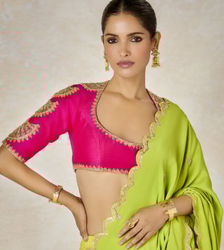 A resplendant vision in gold, The Son Barfi saree is designed in gold tissue. A broad patchwork pallu in a bright lime green and our Anasam Phool motifs in gold. Finished with a reverse scallop border in gold and a multi color border and paired with a lime green scoop neck patchwork blouse with intricate gold dori and sequins work. The dupatta is adorned with ananas motifs in striped multicolor border with dori and sequins work .