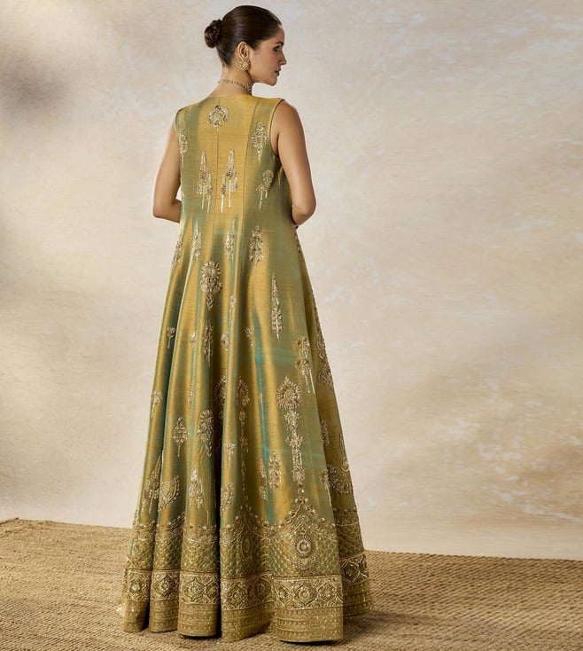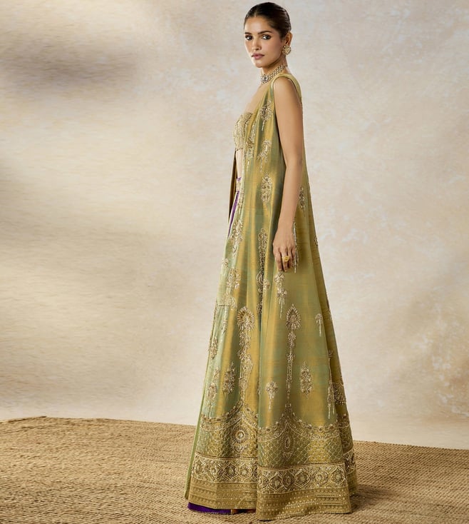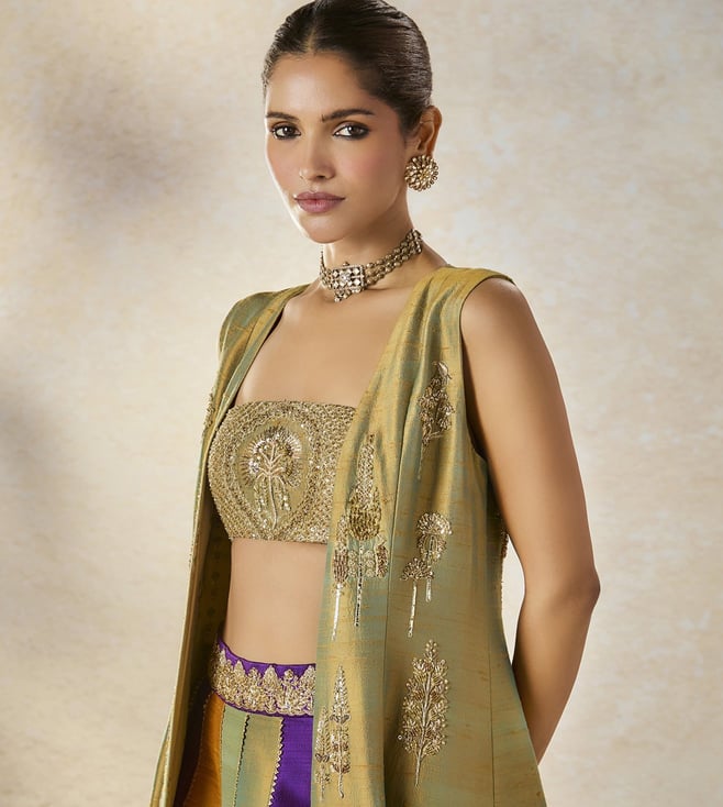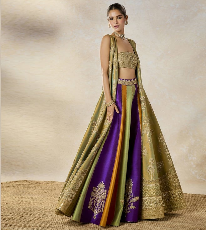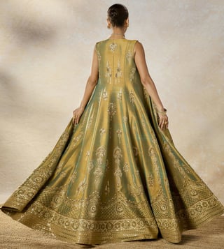 The Kesar Varak Long Jacket Lehenga Set is a stunning two-tone ensemble featuring a beautifully embroidered long jacket adorned with intricate motifs like Raj Pankh, Baug Taj, and Anasam Phool, adding a regal and traditional touch. The set is paired with a delicately embroidered bustier that perfectly complements the jacket¿s detailing. The lehenga, in a rich multi-colored palette, mirrors the same motifs, creating a cohesive and elegant look.