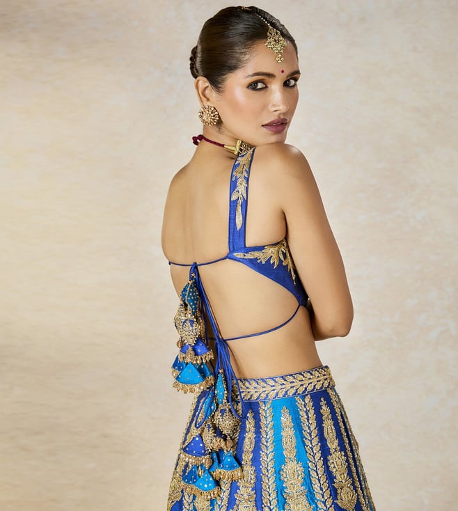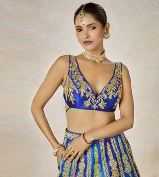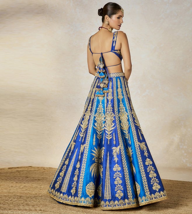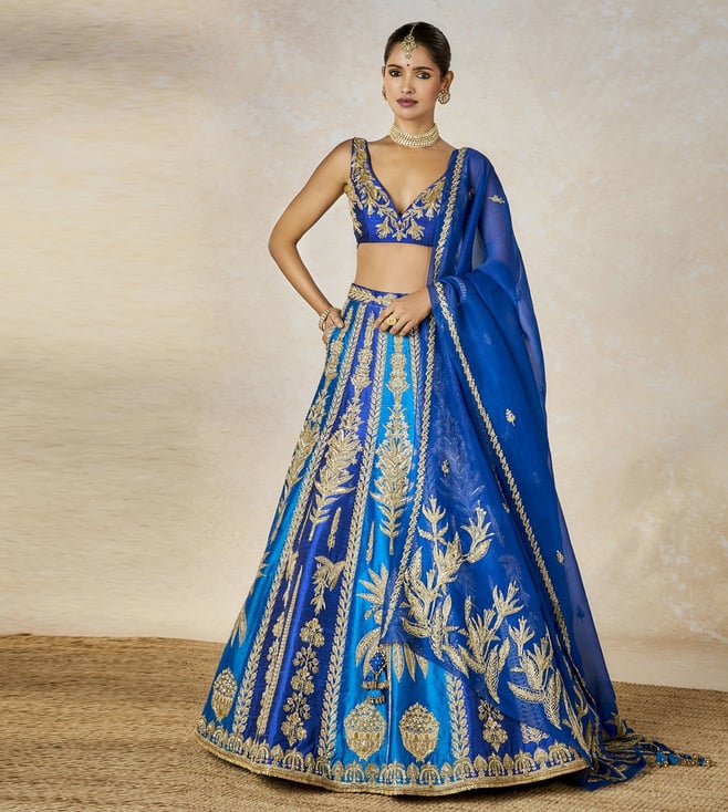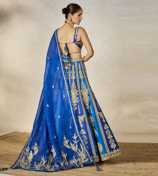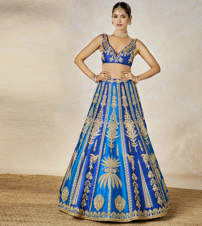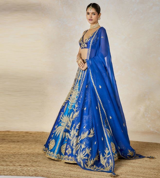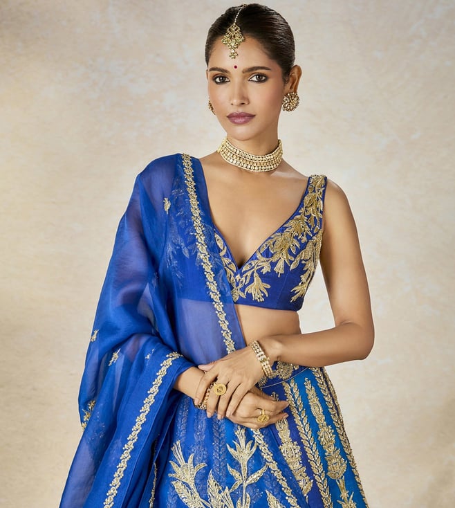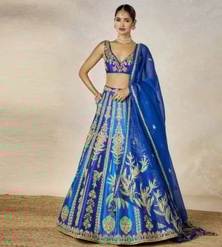 A brilliant Azure blue that sparkles at any occasion, The Neel Bahar lehenga is a sight to behold. Our Sehra motifs that stand delicately throughout the lehenga casting a shimmer that sparkles like no other. It is paired with a sleeveless embelished blouse along with a long tulle dupatta. Featuring hours of artisnal handwork in the form of Zardozi, Katdana and sitara embroidery, This lehenga is a modern day fairytale. Comes with a separate cancan.