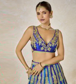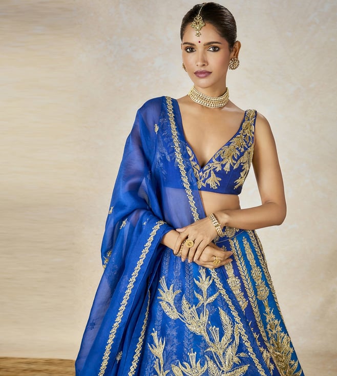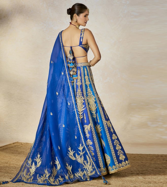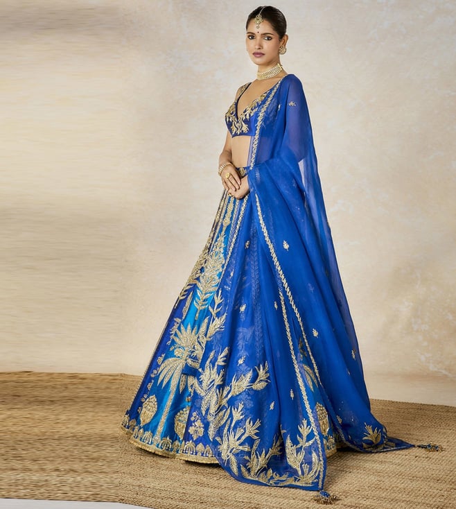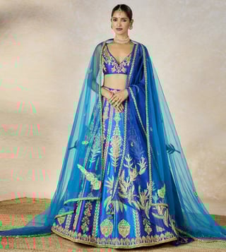 A brilliant Azure blue that sparkles at any occasion, The Neel Bahar lehenga is a sight to behold. Our Sehra motifs that stand delicately throughout the lehenga casting a shimmer that sparkles like no other. It is paired with a sleeveless embelished blouse along with a long tulle dupatta. Featuring hours of artisnal handwork in the form of Zardozi, Katdana and sitara embroidery, This lehenga is a modern day fairytale. Comes with a separate cancan.