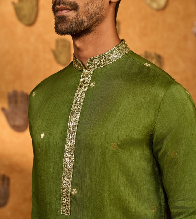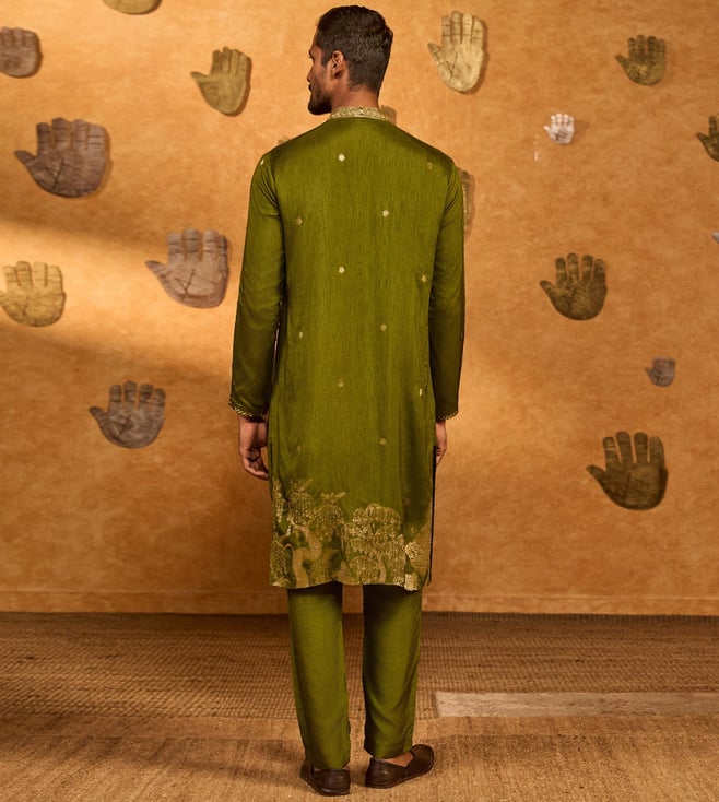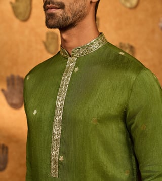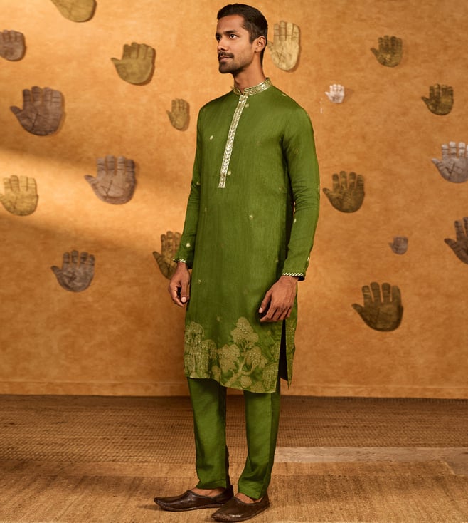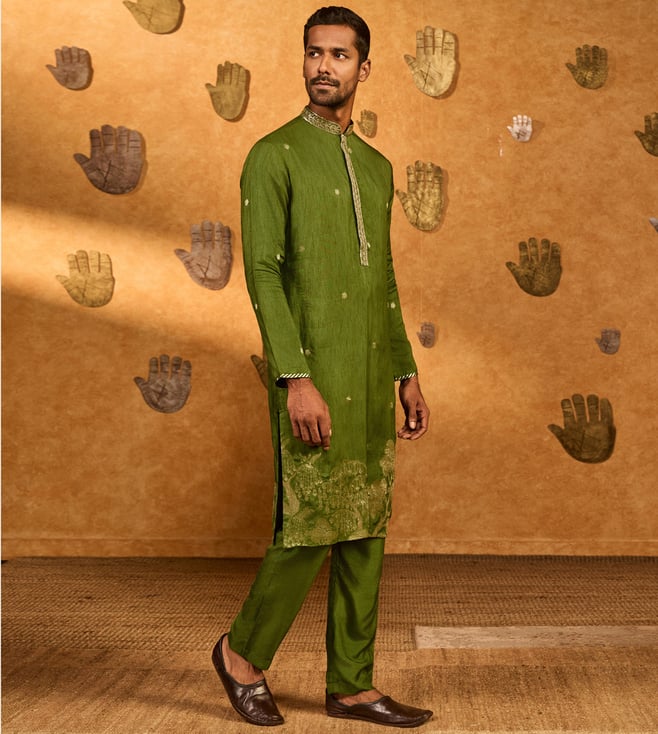 The Masaba Green Jacquard Relaxed Fit Kurta Set This women's dress combines traditional fabric with vibrant colors for a unique style. Disclaimer: All other items in the image are only for display purposes and will not be a part of the delivery content. Product colour may slightly vary due to photographic lighting sources. Country of Origin - India.