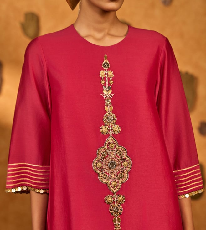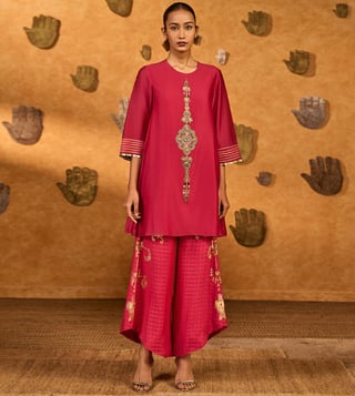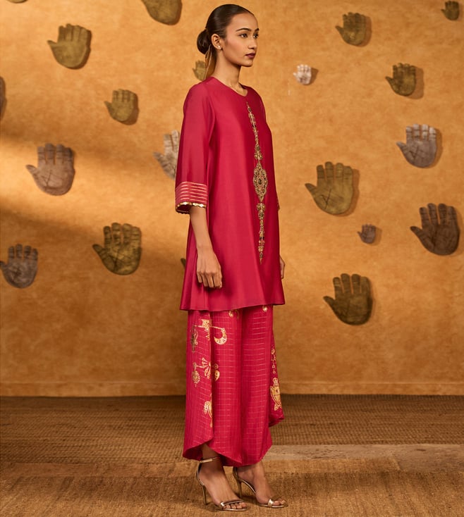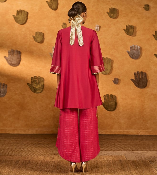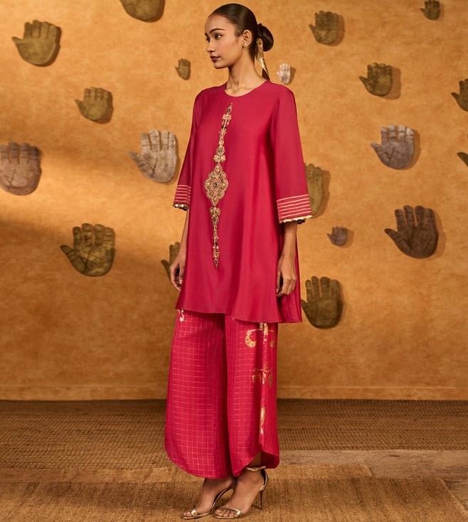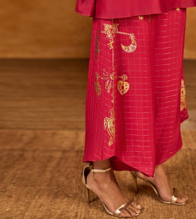 The Masaba Raspberry Raw Silk Zari Checks Relaxed Fit Suit Set This women's dress combines traditional fabric with vibrant colors for a unique style. Disclaimer: All other items in the image are only for display purposes and will not be a part of the delivery content. Product colour may slightly vary due to photographic lighting sources. Country of Origin - India.