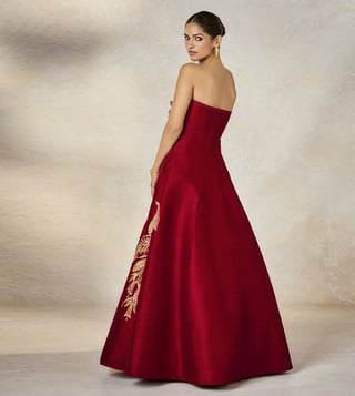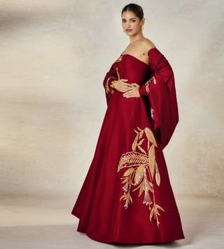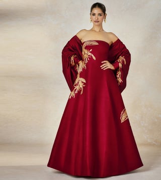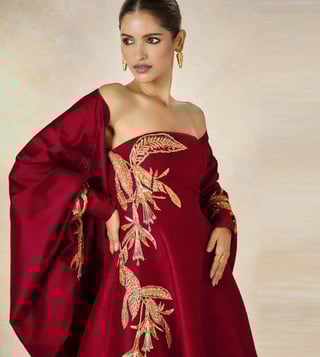 The Paan Pasand gown is a testament of true artistry. A strapless silk gown with dramatic scattered motifs of 'Kusum Kali' covering the bodice, paired with a balloon jacket inspired by 'Berry Bel'. These motifs create a medley like no other, they are brought to life with the age old craft of zardozi, sitara and moti chala embroidery making this ensemble a standout at any occasion.