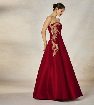The Paan Pasand gown is a testament of true artistry. A strapless silk gown with dramatic scattered motifs of 'Kusum Kali' covering the bodice. These motifs create a medley like no other, they are brought to life with the age old craft of zardozi, sitara and moti chala embroidery making this ensemble a standout at any occasion.