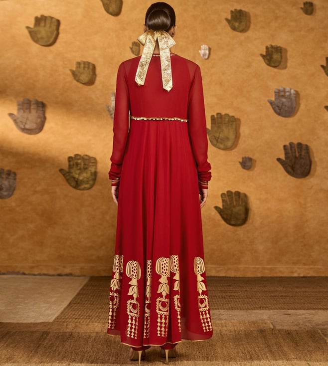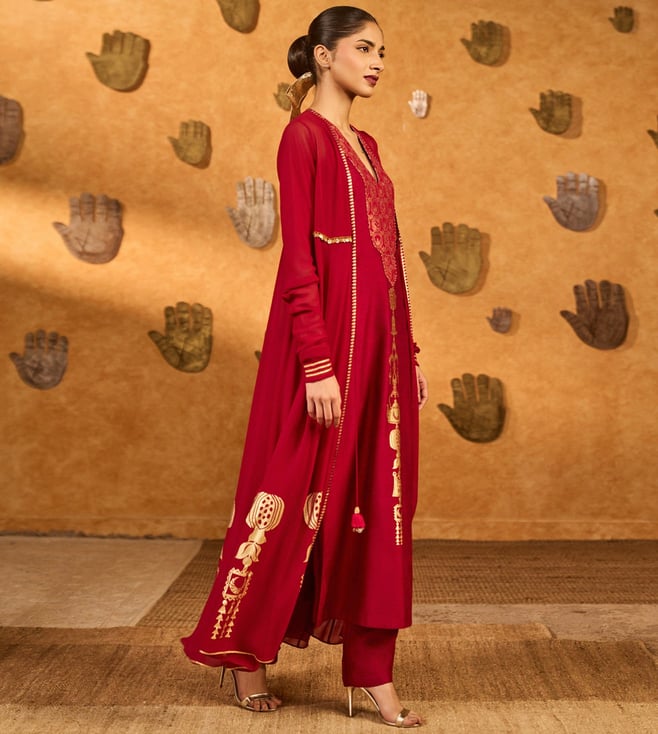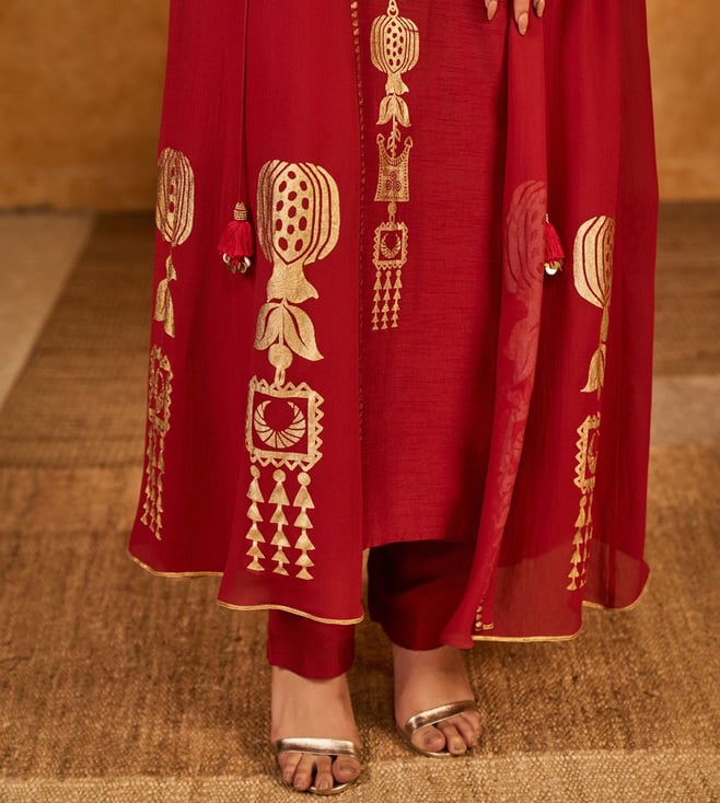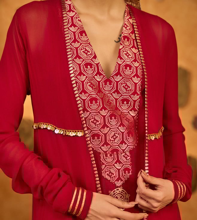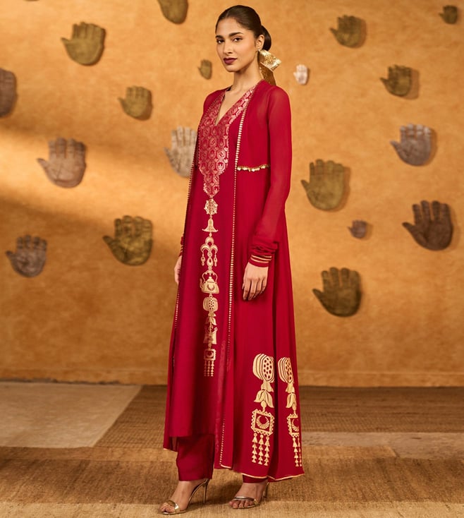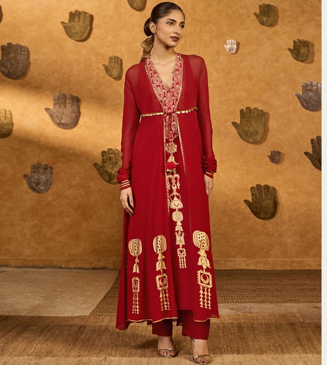 Discover the Crafted from luxurious satin, Masaba Red Raw Silk Georgette Fitted Suit Set this dress offers elegance and versatility in vibrant hues. Disclaimer: All other items in the image are only for display purposes and will not be a part of the delivery content. Product colour may slightly vary due to photographic lighting sources. Country of Origin - India.