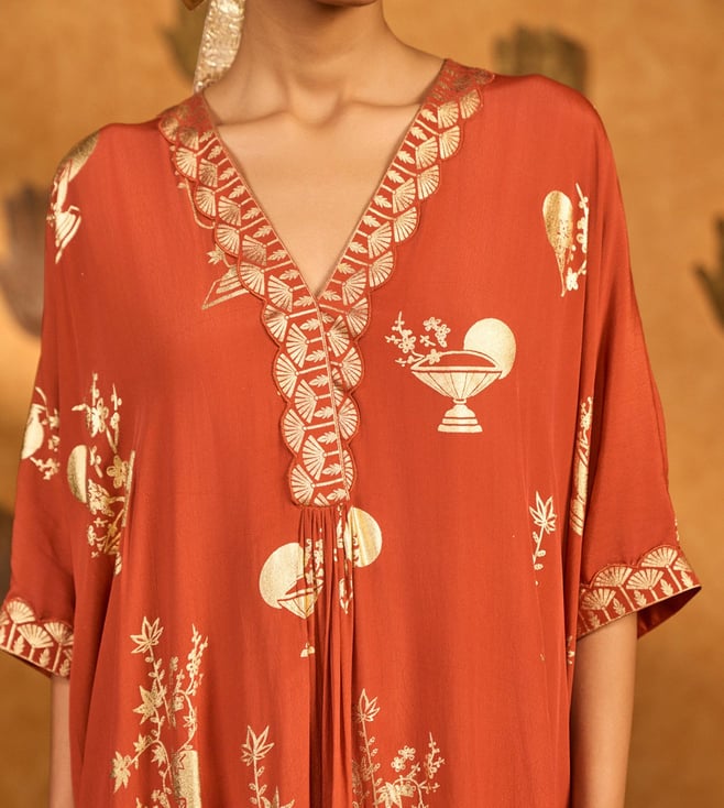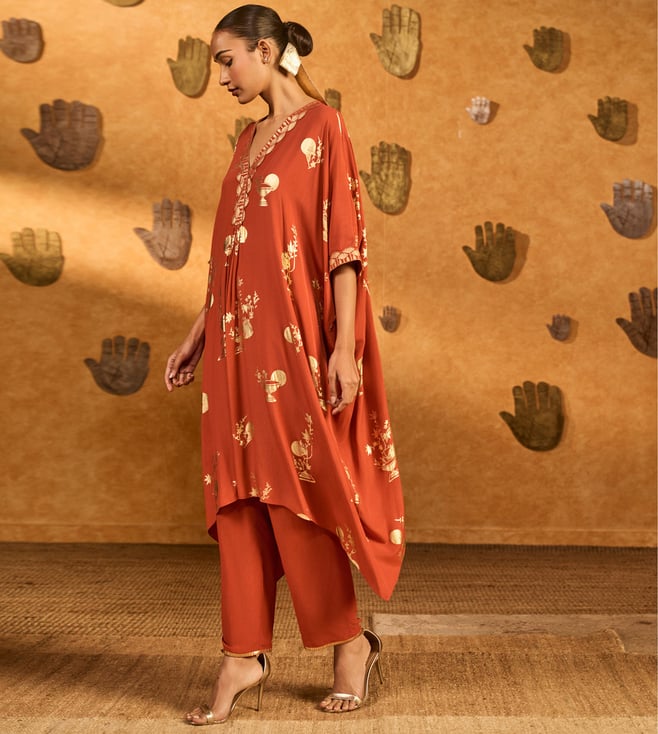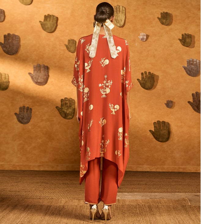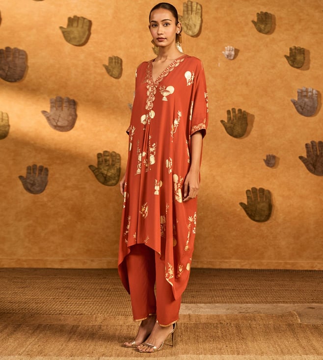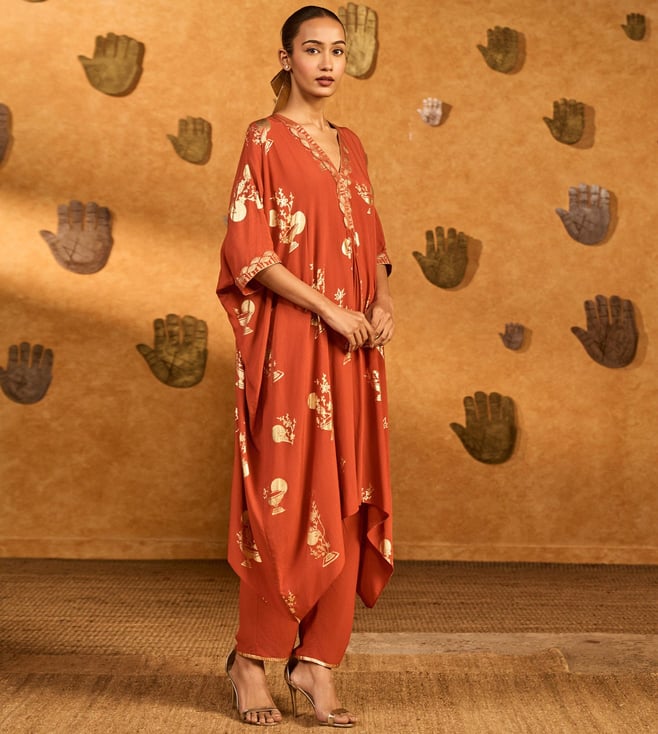 The Masaba Rust Crepe Silk Fitted Suit Set This women's dress combines traditional fabric with vibrant colors for a unique style. Disclaimer: All other items in the image are only for display purposes and will not be a part of the delivery content. Product colour may slightly vary due to photographic lighting sources. Country of Origin - India.