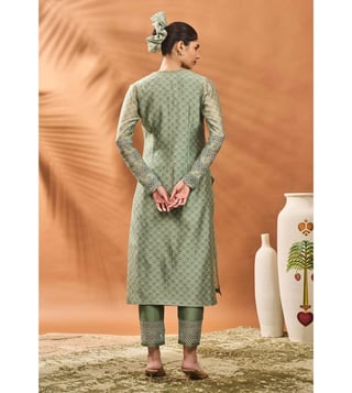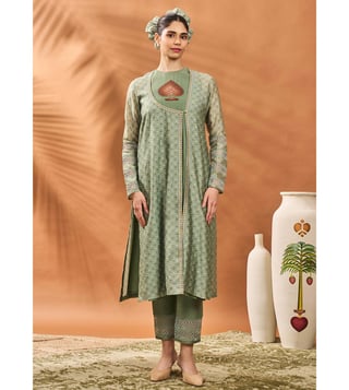 Discover the Crafted from luxurious satin, Masaba Sage Green Tree Of Hearts Angrakha Kurta Set this dress offers elegance and versatility in vibrant hues. Disclaimer: All other items in the image are only for display purposes and will not be a part of the delivery content. Product colour may slightly vary due to photographic lighting sources. Country of Origin - India.