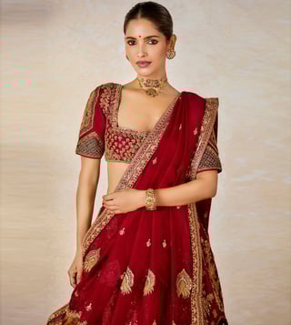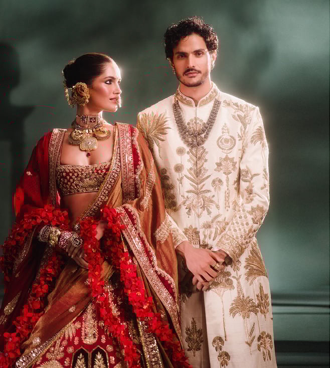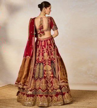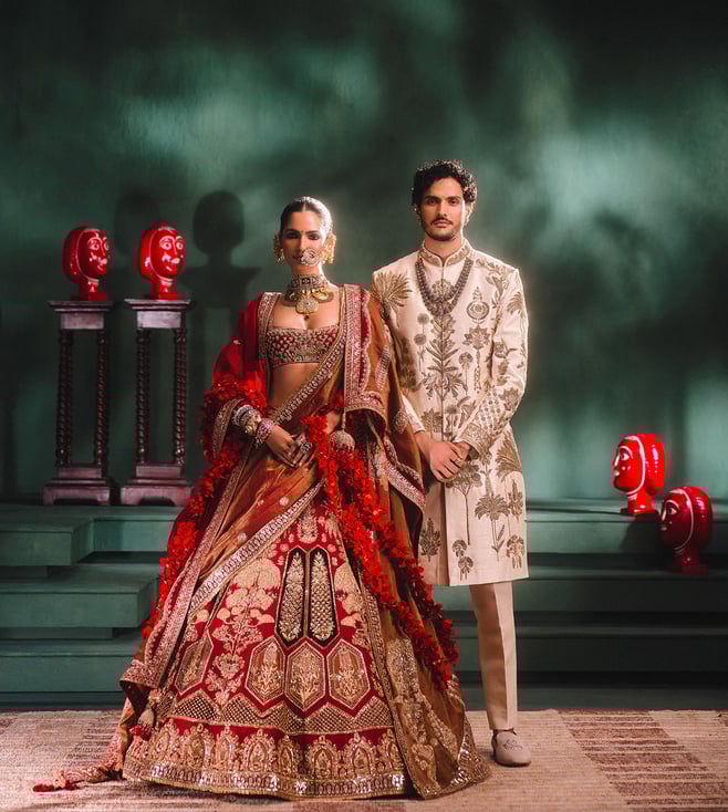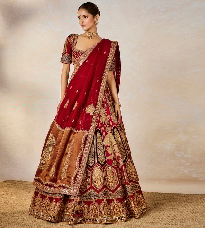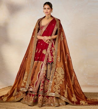 Resplendence takes a rare form in this ornate ensemble. The Anar Bagh lehenga is a velvet patchwork lehenga adorned with our Anant Bel and Anasam Rekha motifs, which has tissue inlays running across the the bottom of the lehenga. Our Baug Taj motifs are intricately embroidered on the tissue and finished with a jaal tissue patchwork. Comes with a separate cancan.