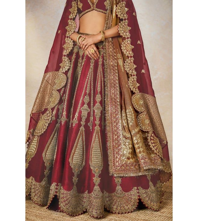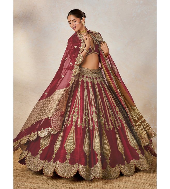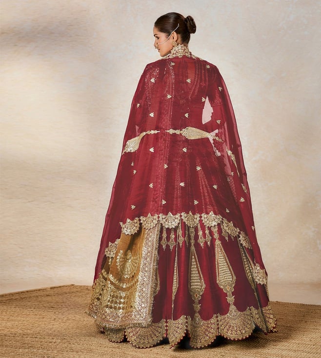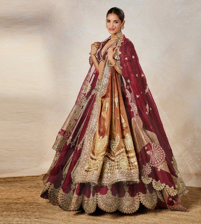 Sweet and decadent like 'Gajrela", The Gajar Halwa lehenga roots itself in the heritage 'Raj Pankh'. The lehenga consists of a patchwork tissue 'Kalash' motif with bright gold embroidery. With 2 dupattas pairing with this ensemble, one has a scallop applique border and the other is a tissue patchwork dupatta, perfect for the bride that wants to be close to tradition. Comes with a separate cancan.