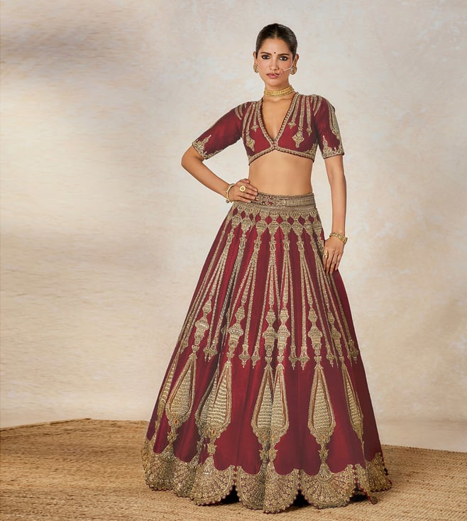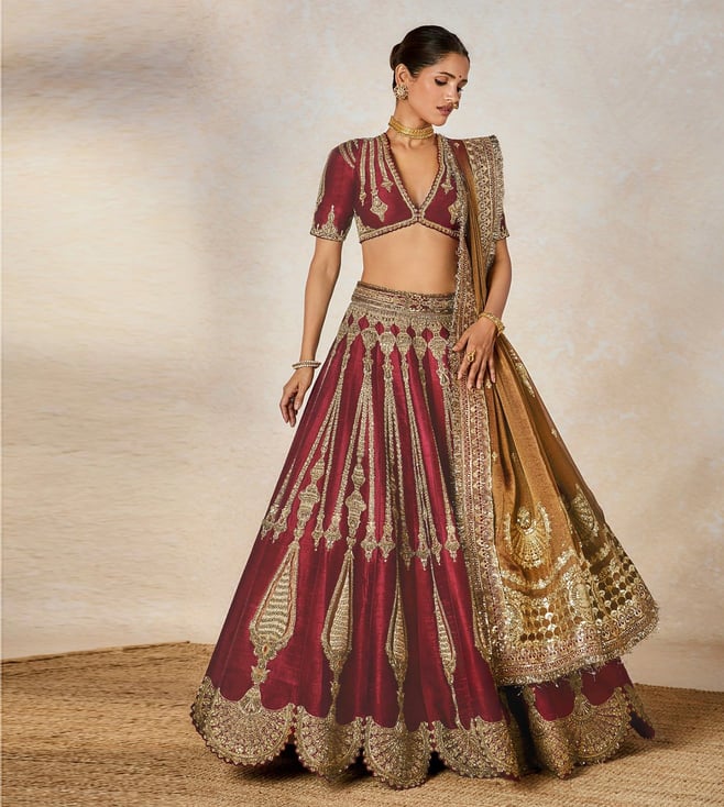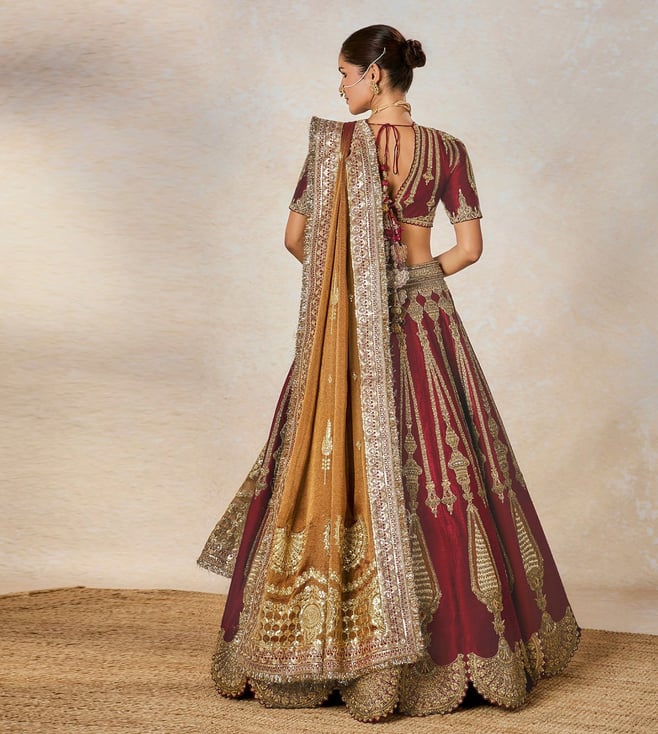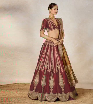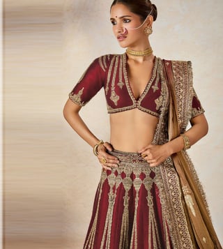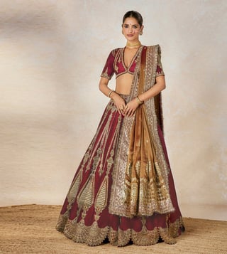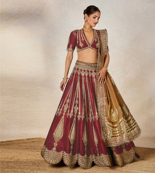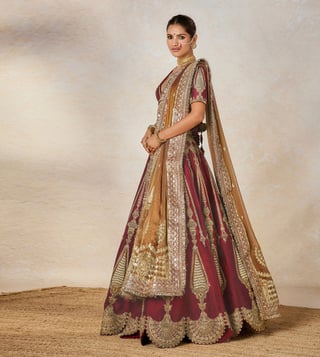 Sweet and decadent like 'Gajrela", The Gajar Halwa lehenga roots itself in the heritage 'Raj Pankh'. The lehenga consists of a patchwork tissue 'Kalash' motif with bright gold embroidery. With a dupattas pairing with this ensemble, one has a scallop applique border, perfect for the bride that wants to be close to tradition. Comes with a separate cancan.