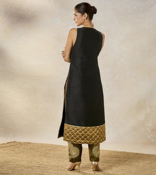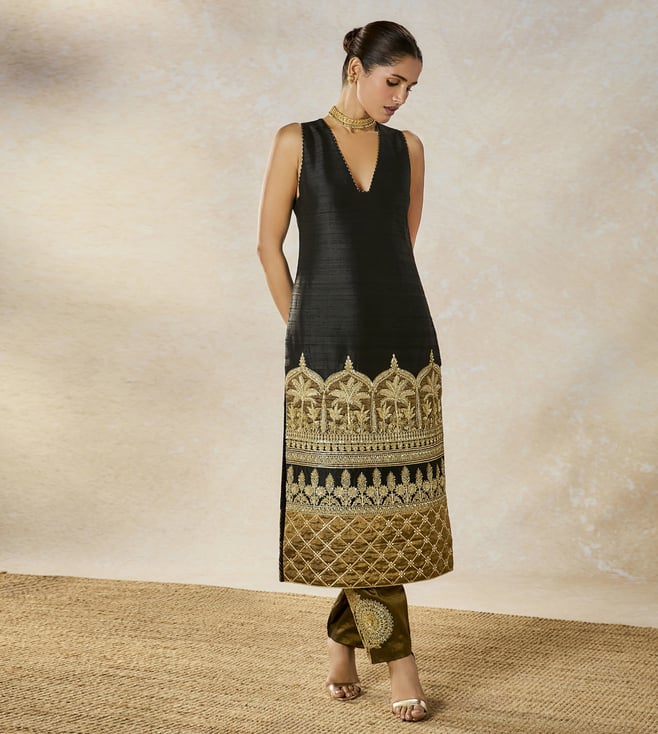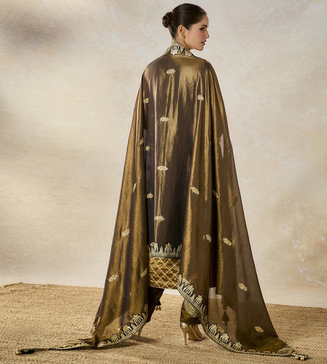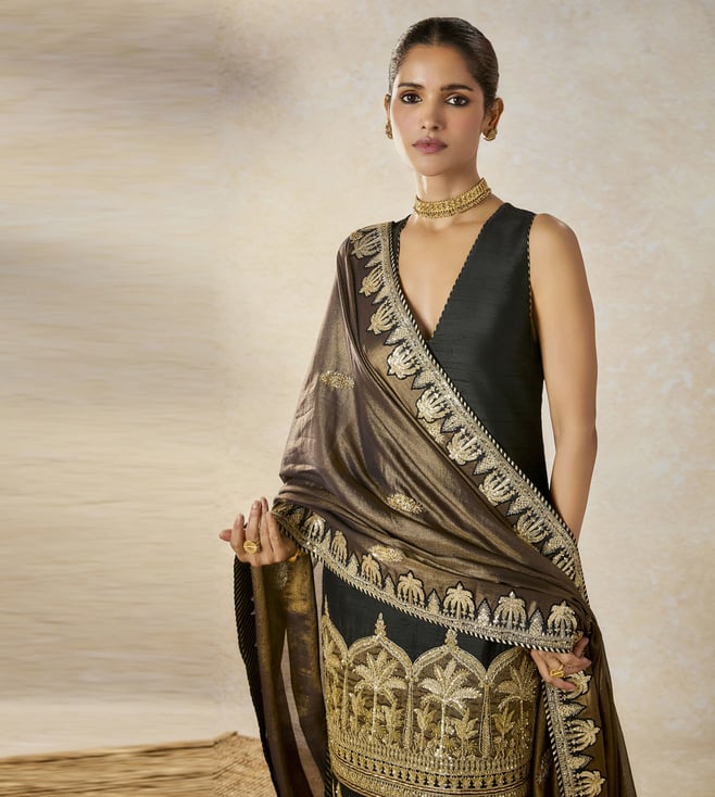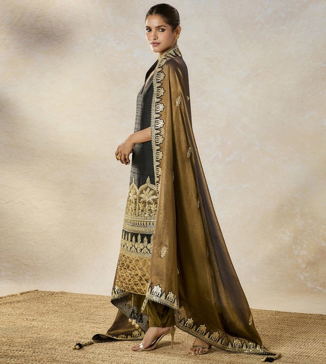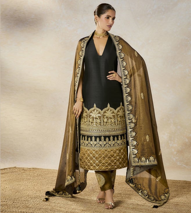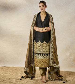 The Kala Khatta salwar set features tissue patchwork with jaal embroidery across the hem, with our Gul Jharokha motif sitting atop the luxurious border like a crown. Set against a midnight background , this Kurta and Salwar set is for the woman who embodies the boldness, fragility, and emotions of a bride-to-be.