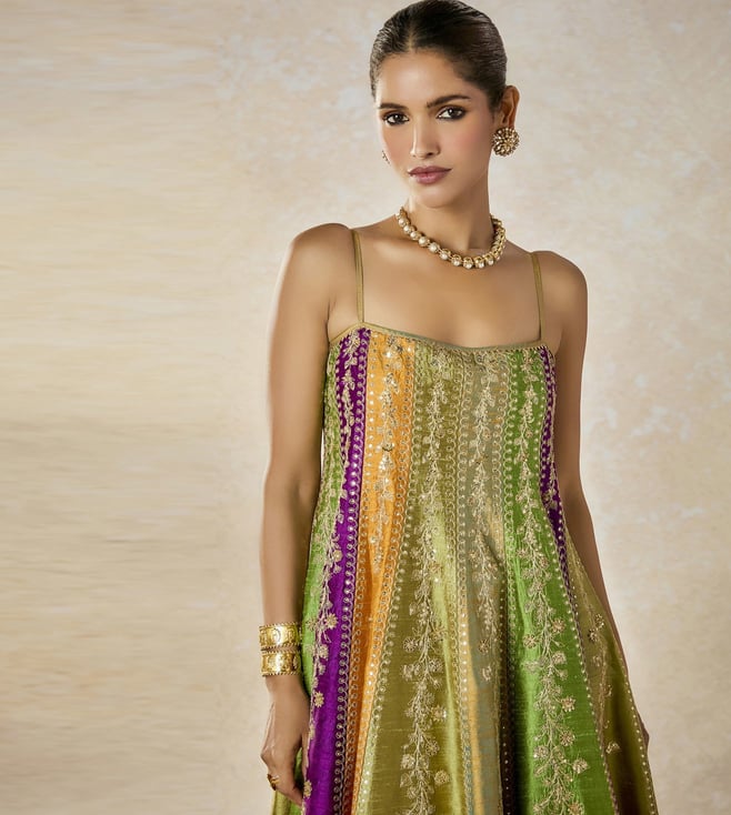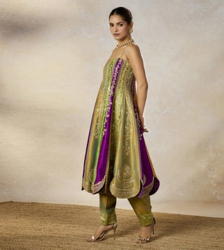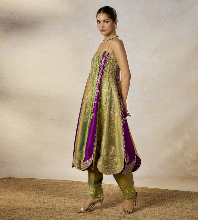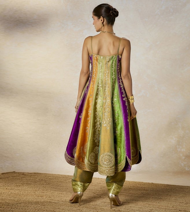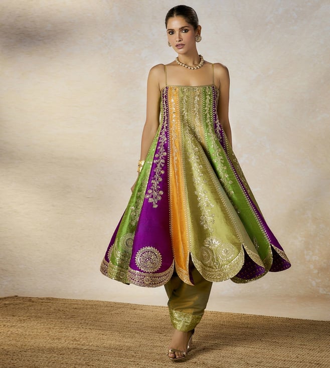 The Paan Pista Anarkali is a vibrant blend of multicolor panels that create a mesmerizing visual symphony. The scalloped hem adds a touch of playful elegance, gracefully framing the silhouette with its delicate curves. This outfit seamlessly fuses traditional craftsmanship with contemporary design, making it a perfect choice for festive occasions or a standout piece at any celebration.